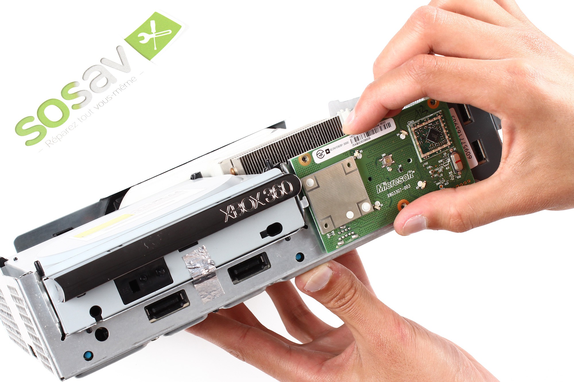 La coque supérieure de la Xbox 360 est désormais démontée.
