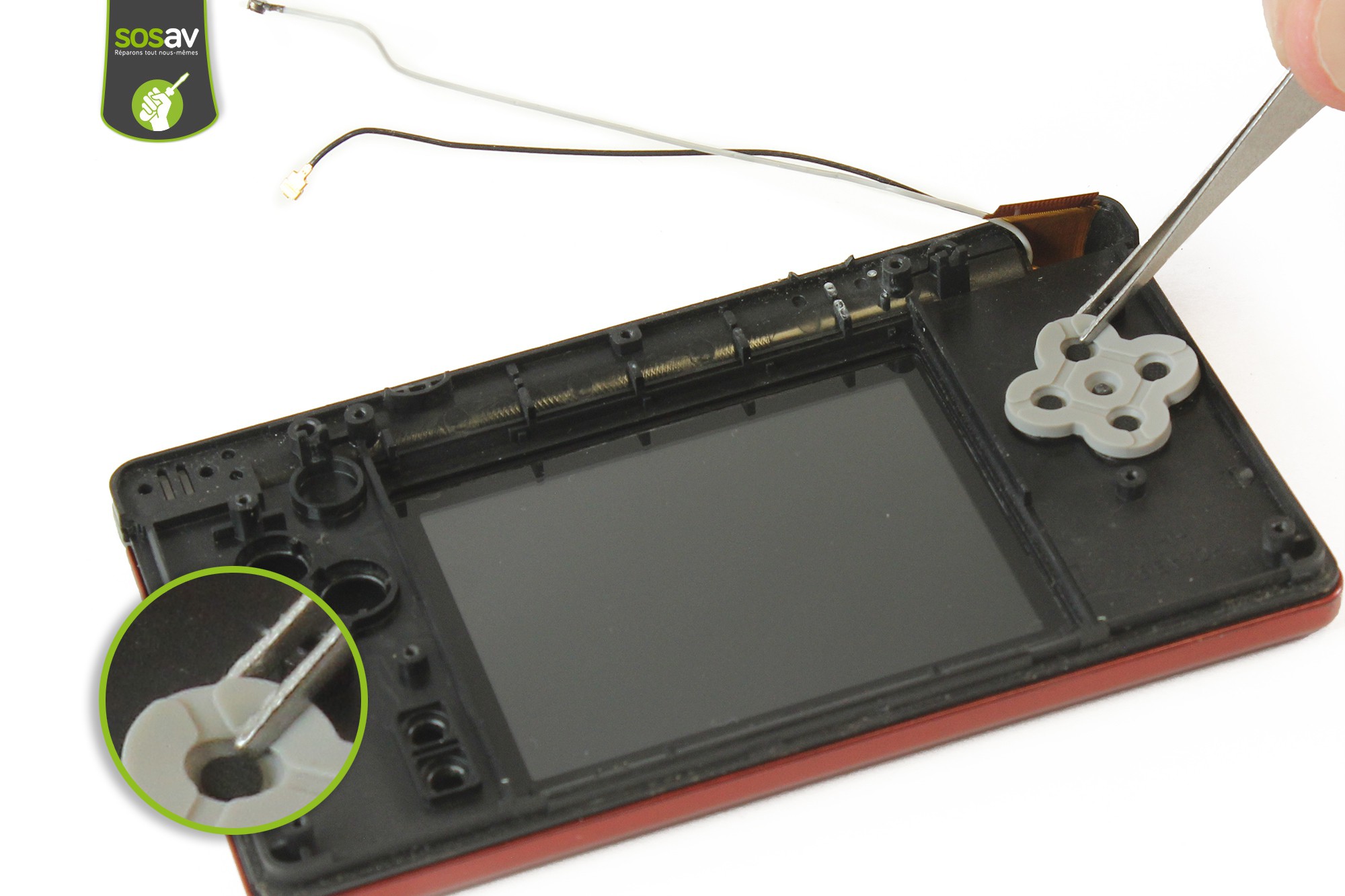 Saisissez le caoutchouc et les boutons start et select à l'aide de la pince et procédez à leur retrait.