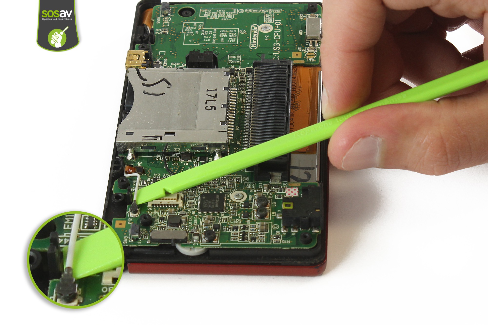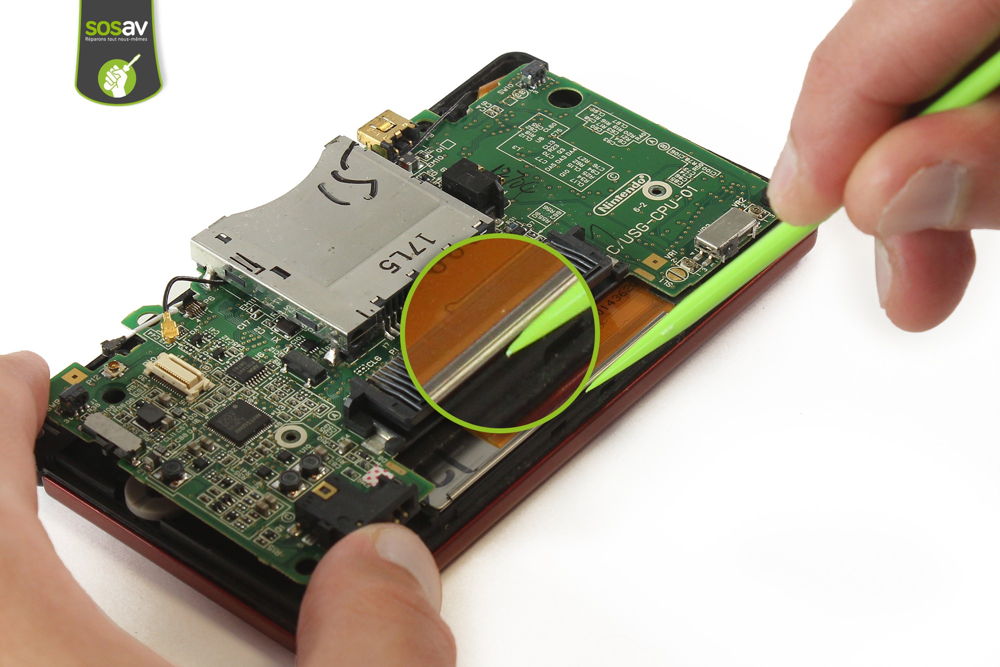 Insérez la spatule en nylon dans l'interstice de l'écran inférieur-châssis et faites doucement levier pour sortir la carte du châssis.Retournez l'ensemble de 90°.Attention : une nappe lie l'écran supérieur au reste de la console ! Ne retirez pas tout de suite la carte mère !