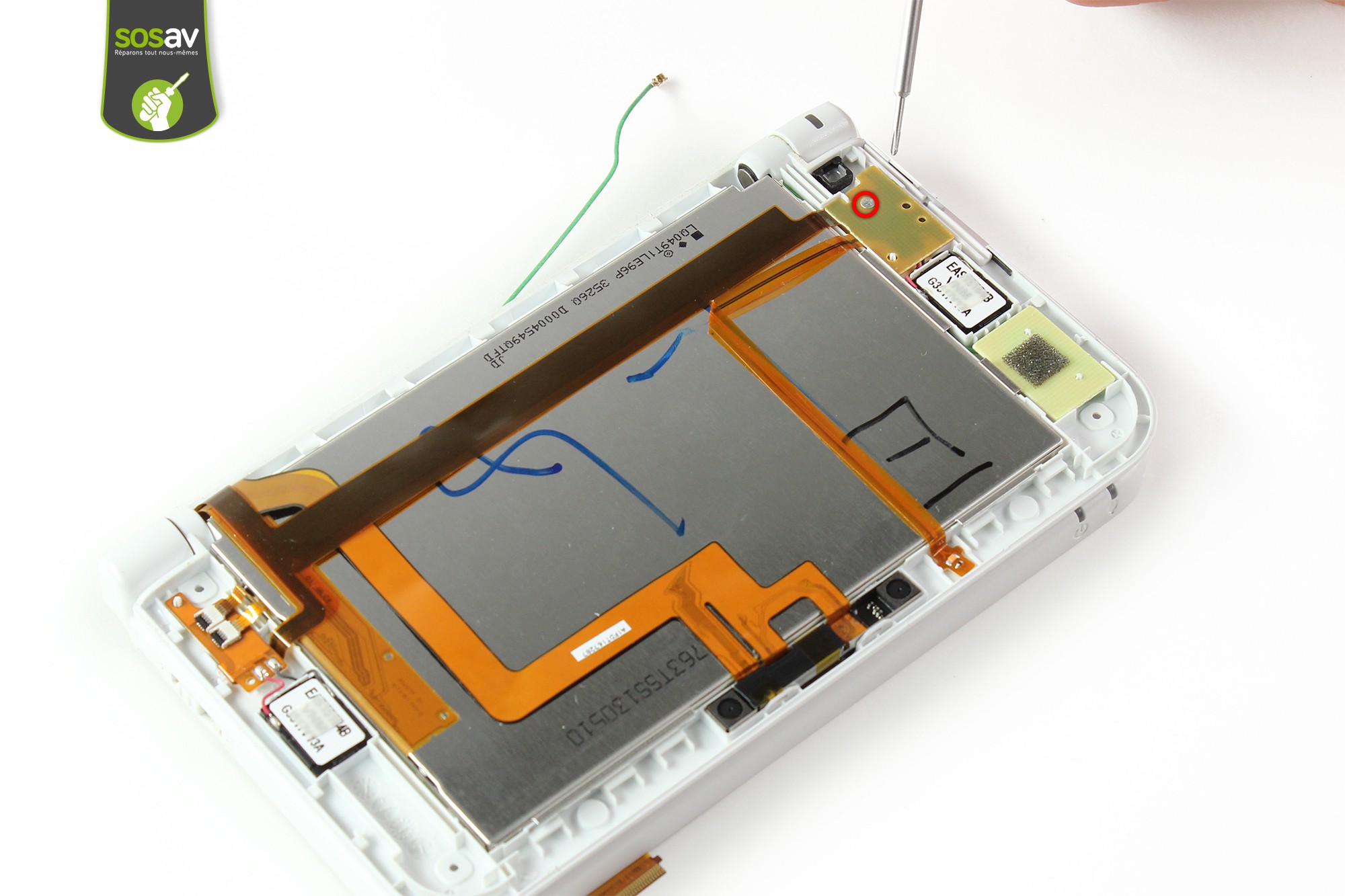 A l'aide du cruciforme, dévissez la vis entourée en rouge maintenant le côté droit de la nappe haut-parleur.
