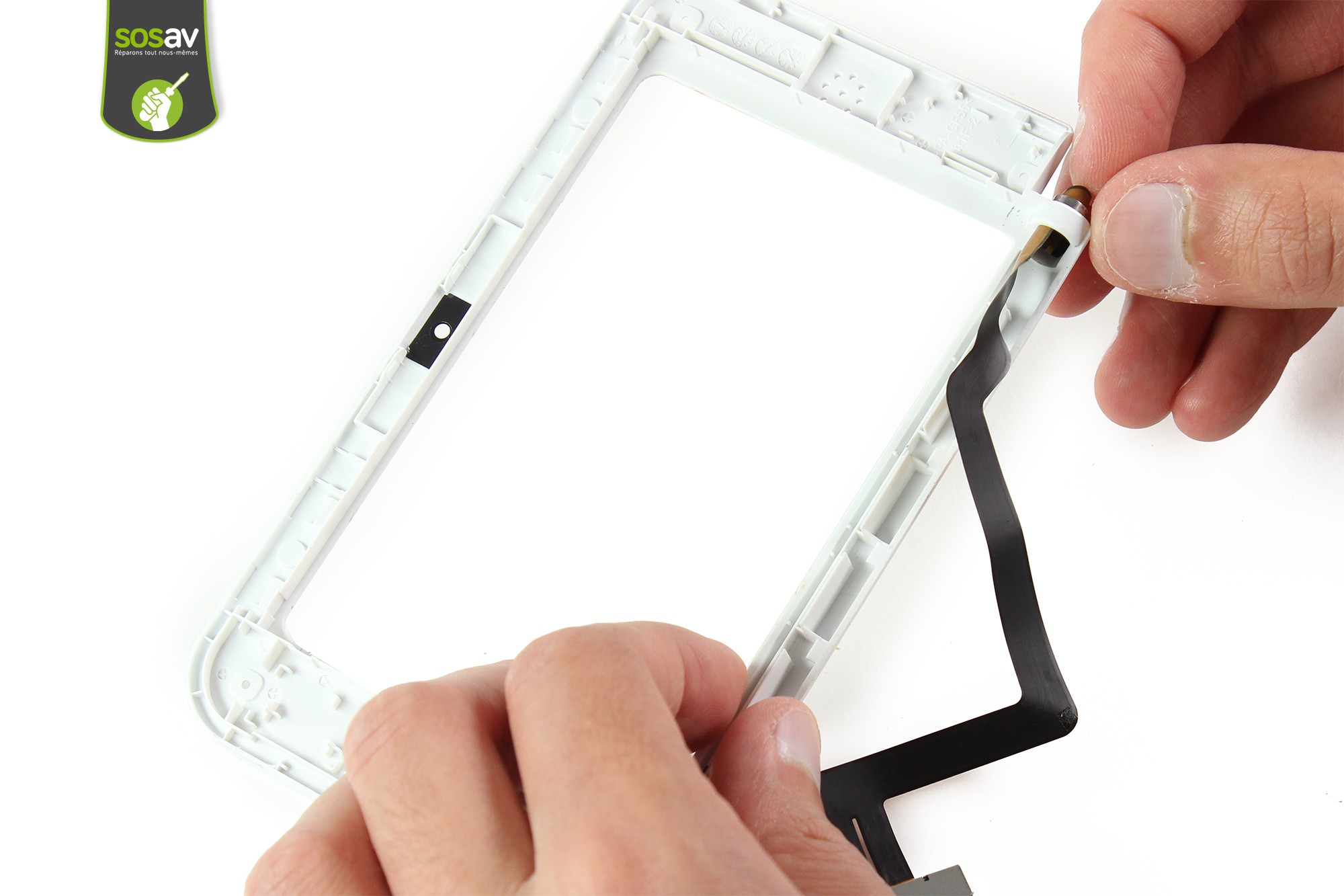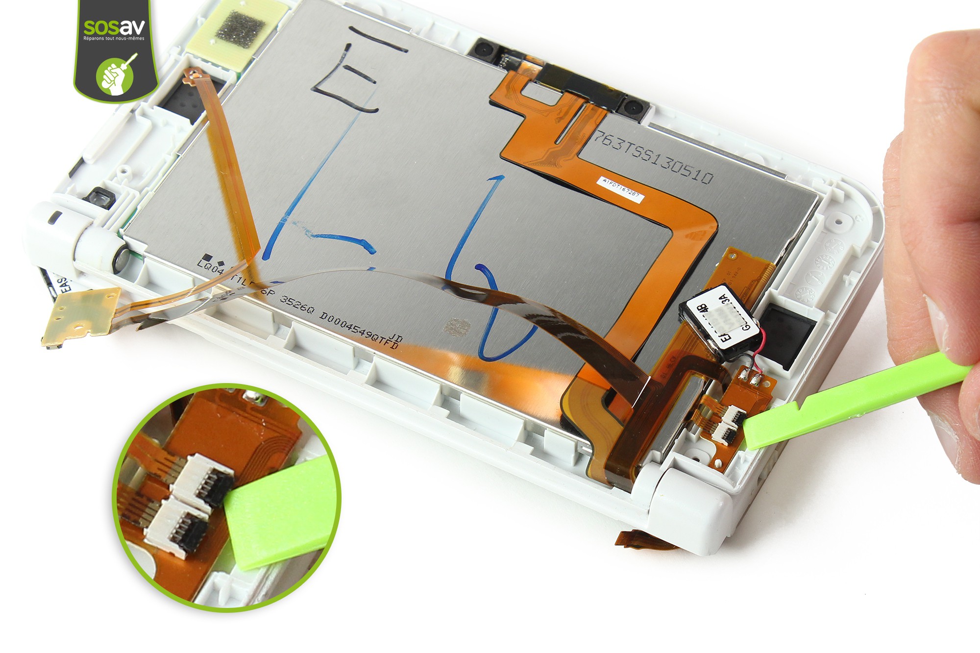 Déverrouillez le connecteur de la vitre tactile avec la spatule en nylon et sortez la nappe de son logement avec la pointe.