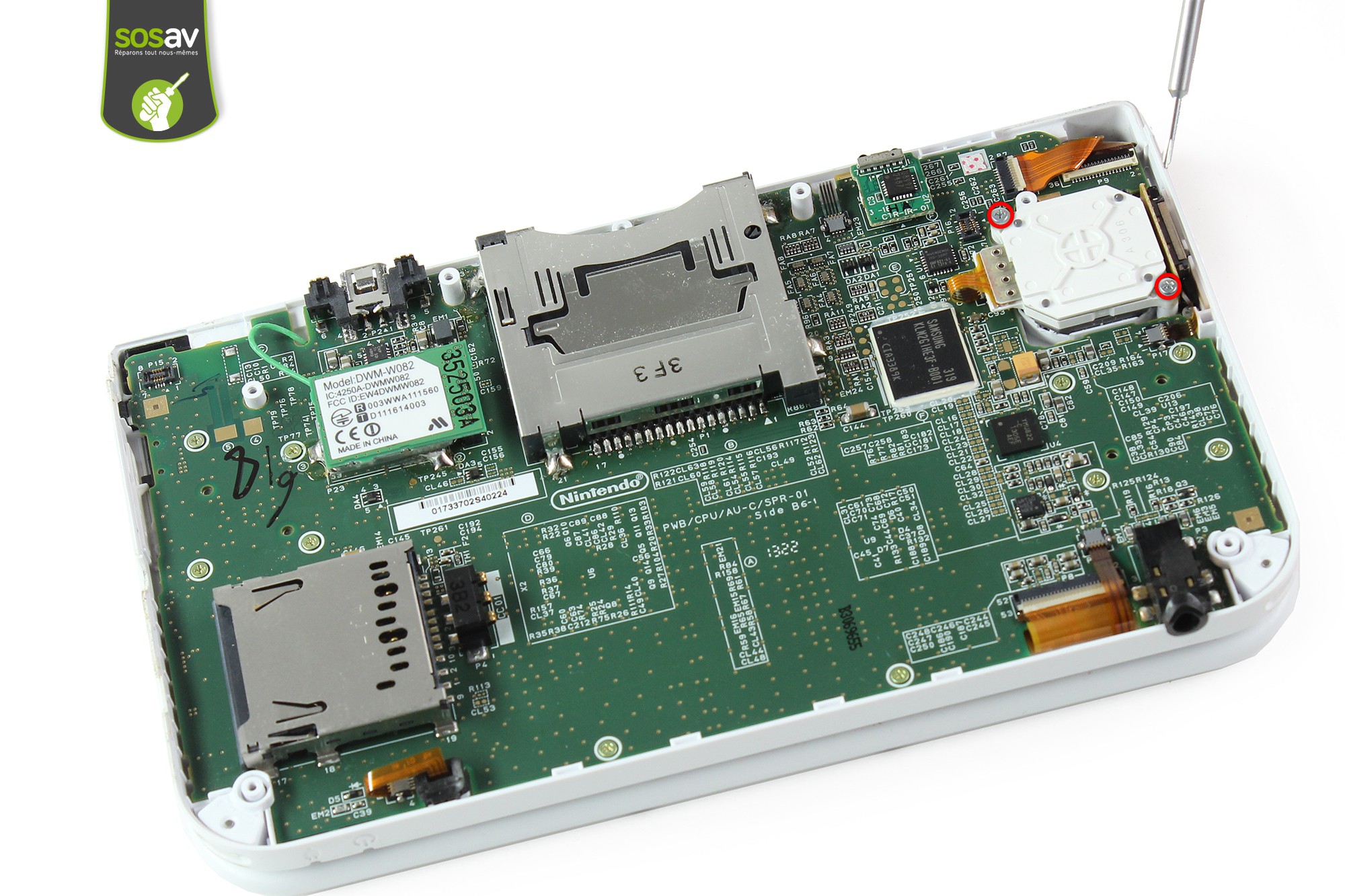 Dévissez les deux vis entourées en rouge avec le cruciforme.Ces vis maintiennent le joystick analogique.
