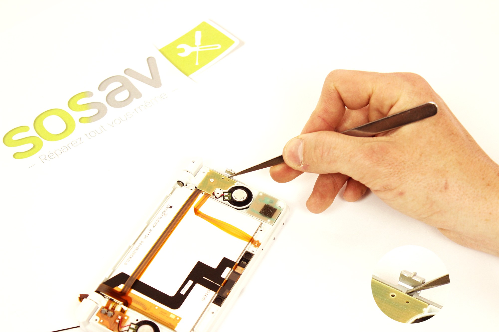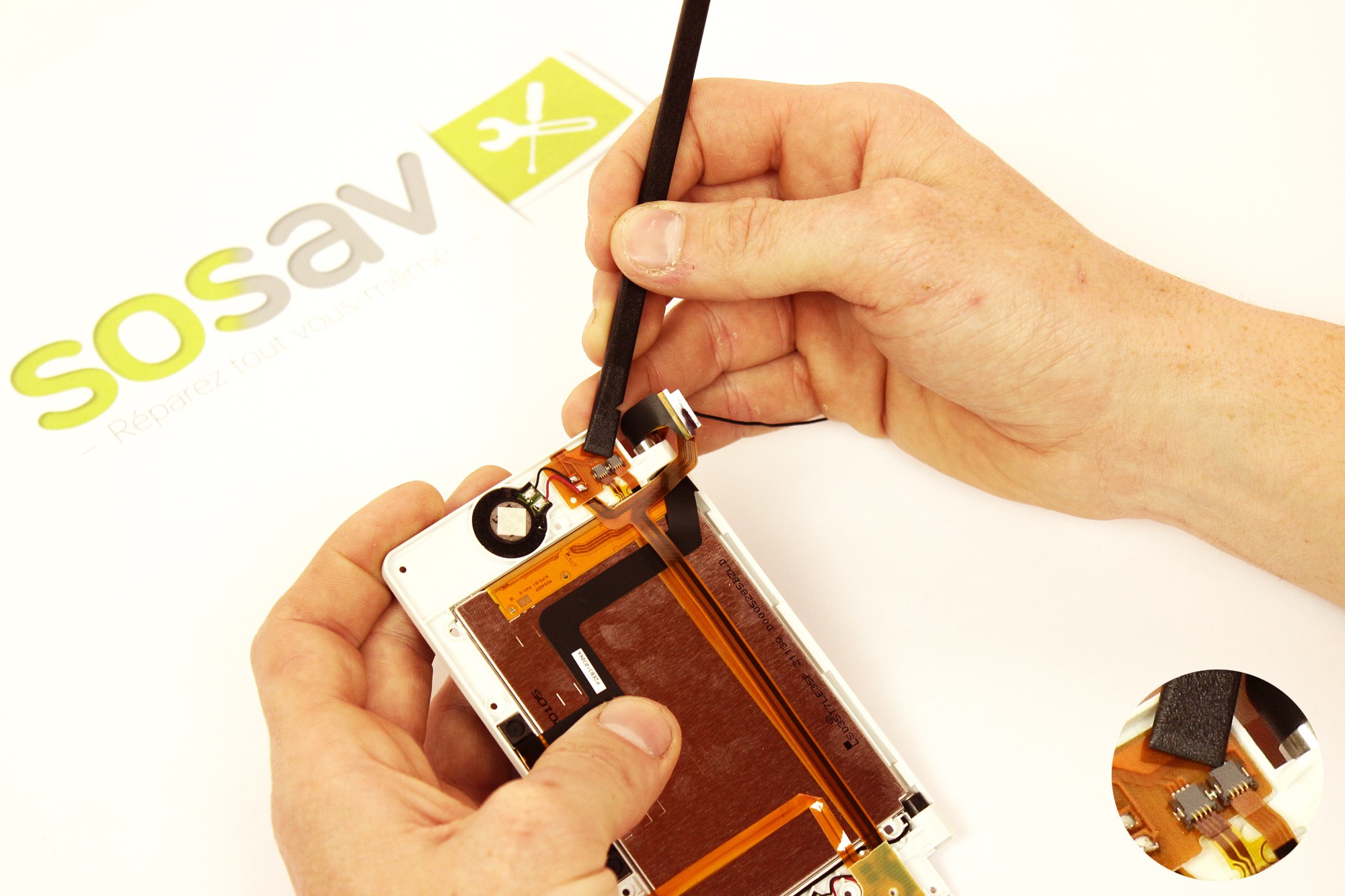 A l'aide d'une pince sortez le micro de son emplacement.il est possible que le caoutchouc de protection du micro reste dans son emplacement. Dans ce cas utilisez la pince pour le sortir.Utilisez désormais une spatule en nylon, pour faire levier sur le clapet du connecteur du micro. Ce clapet doit être levé à 90° comme sur la 3ème photo.Une fois le clapet levé, vous pouvez ôter en toute sécurité le micro de son connecteur.