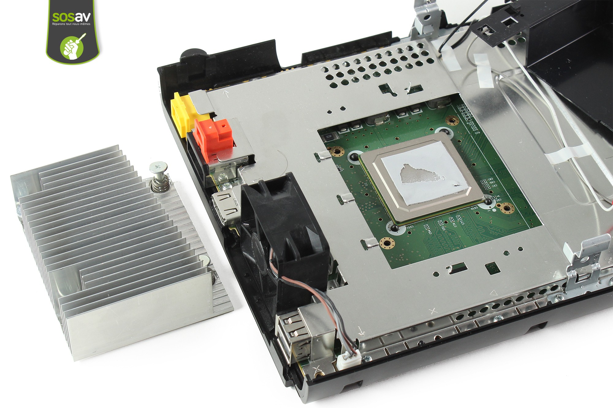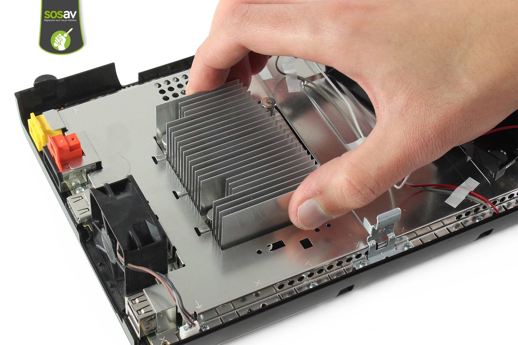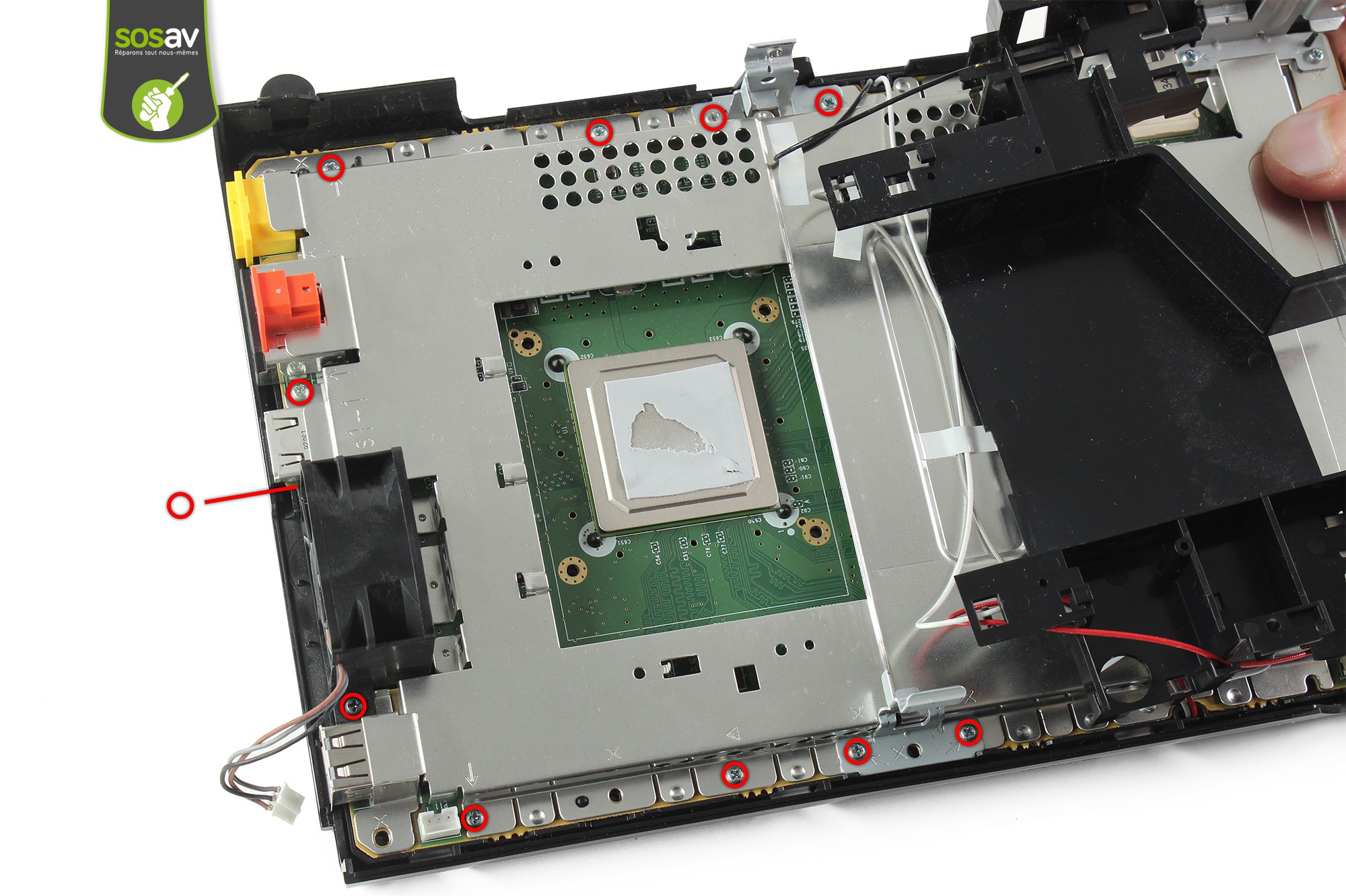 Dévissez les quatre vis entourées en rouge.Ces vis servent à maintenir le radiateur sur le châssis de la console.