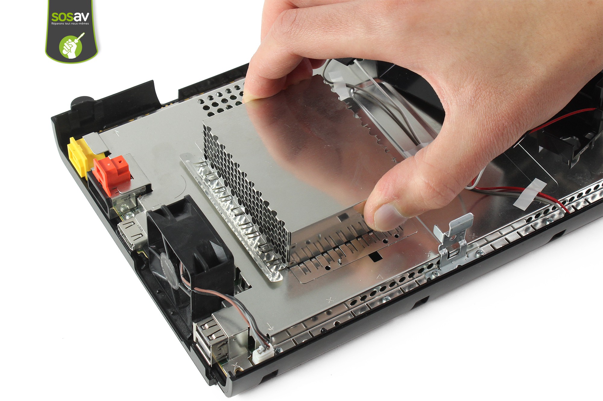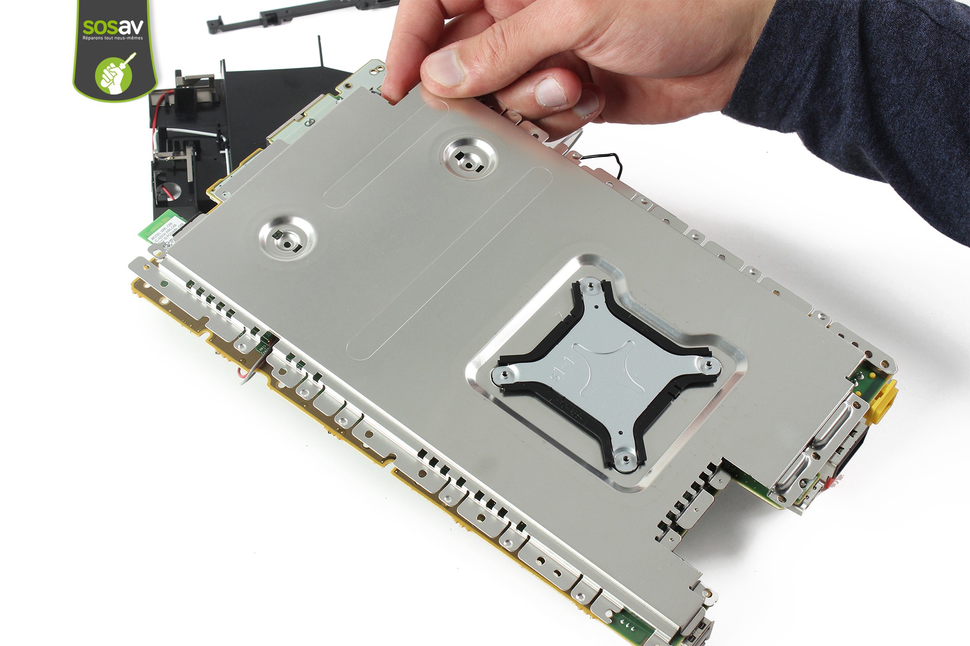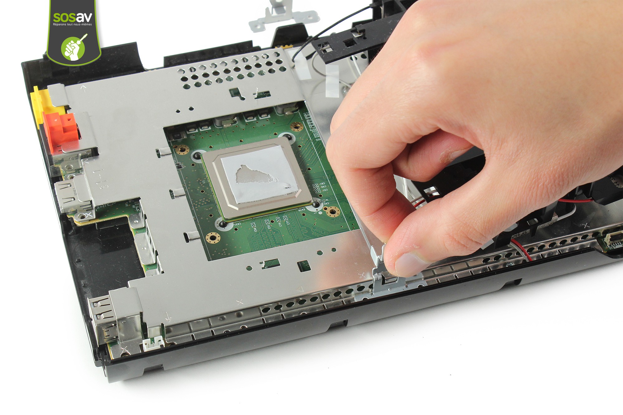Dévissez les quatre vis entourées en rouge.Ces vis servent à maintenir le radiateur sur le châssis de la console.
