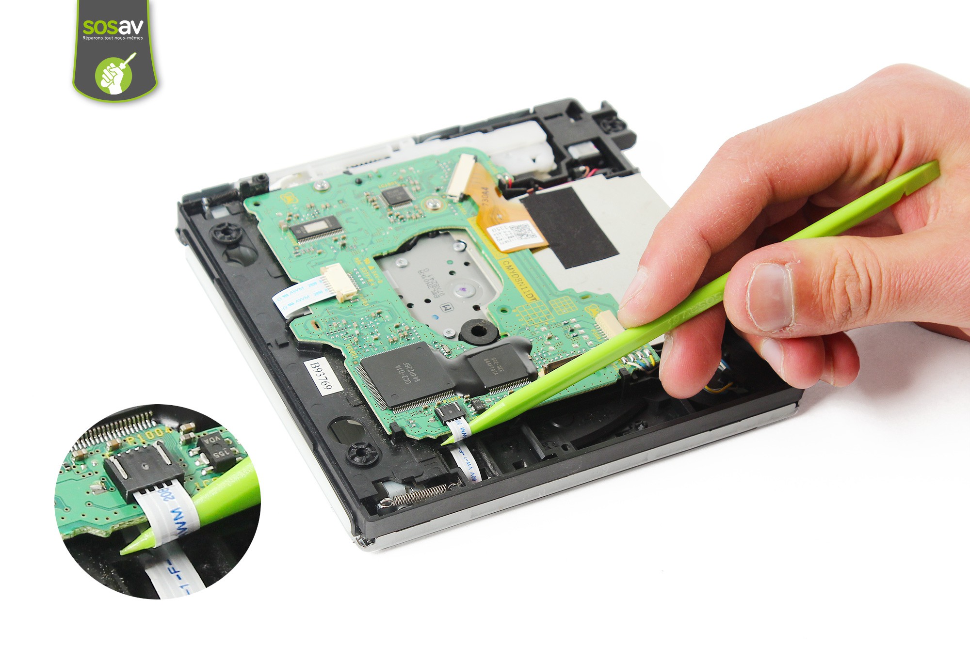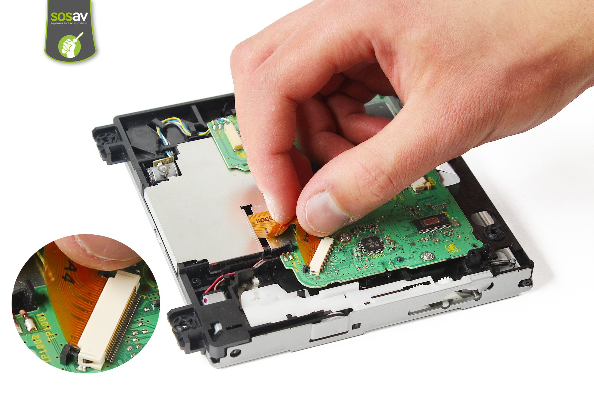 La nappe du moteur d'entraînement du disque sort très facilement. Si cela est nécessaire, utilisez la pointe de la spatule afin de la sortir de son connecteur.Utilisez ensuite la sptaule en nylon afin de décoller l'adhésif de maintien de la nappe de la lentille du lecteur DVD.