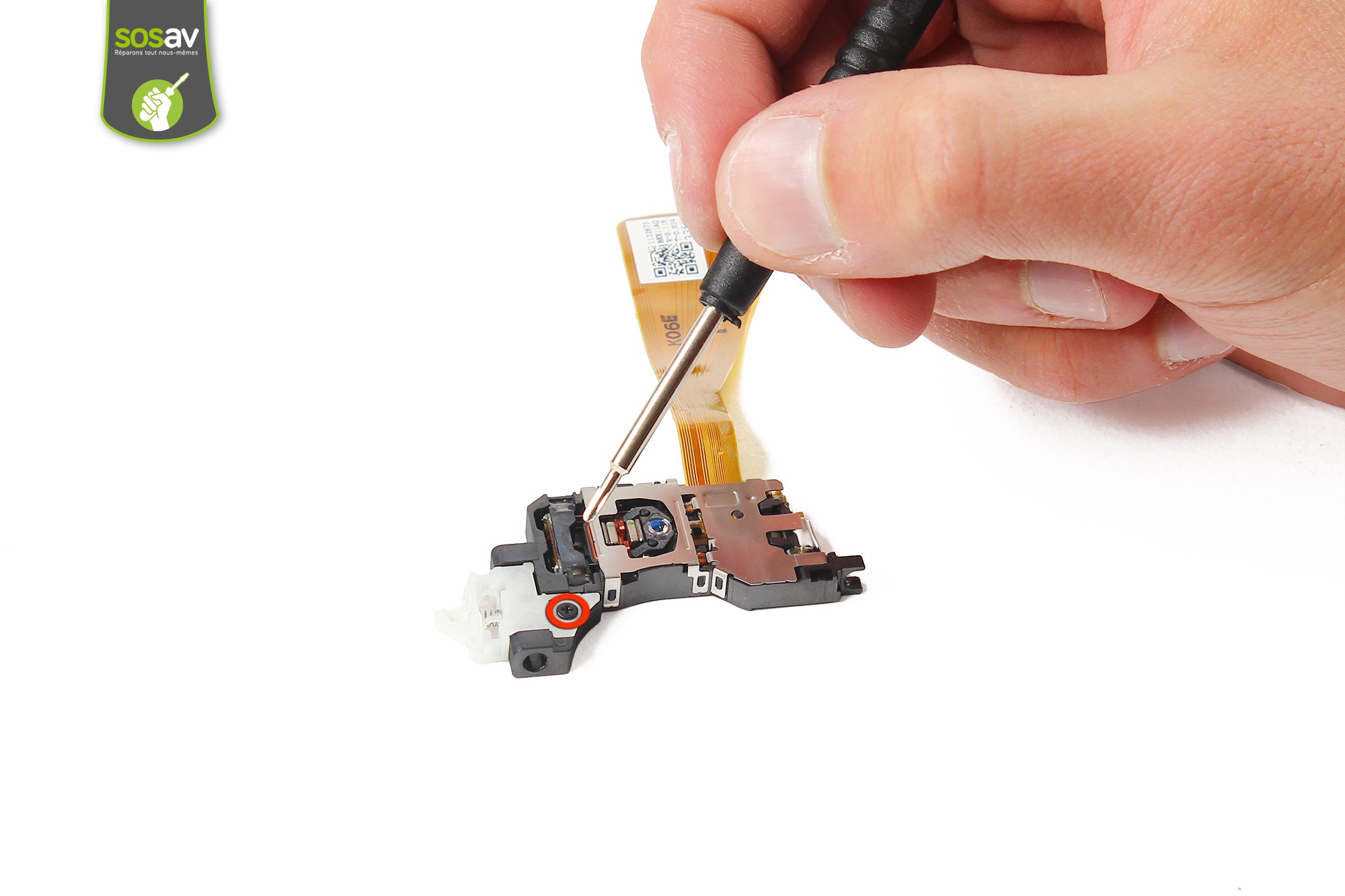 Utilisez le tournevis cruciforme afin de dévisser la vis entourée en rouge.Cette vis sert à maintenir le blindage métallique de protection de la lentille du lecteur DVD.Utilisez ensuite la spatule en nylon afin de déclipser le blindage métallique.