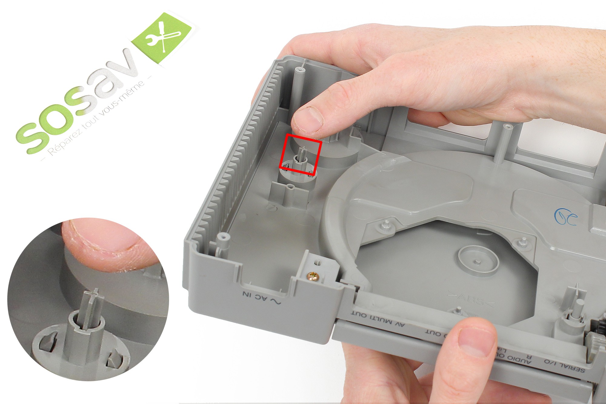 Pressez les 2 clips entourés en rouge, dans le but de libérer le bouton Reset.