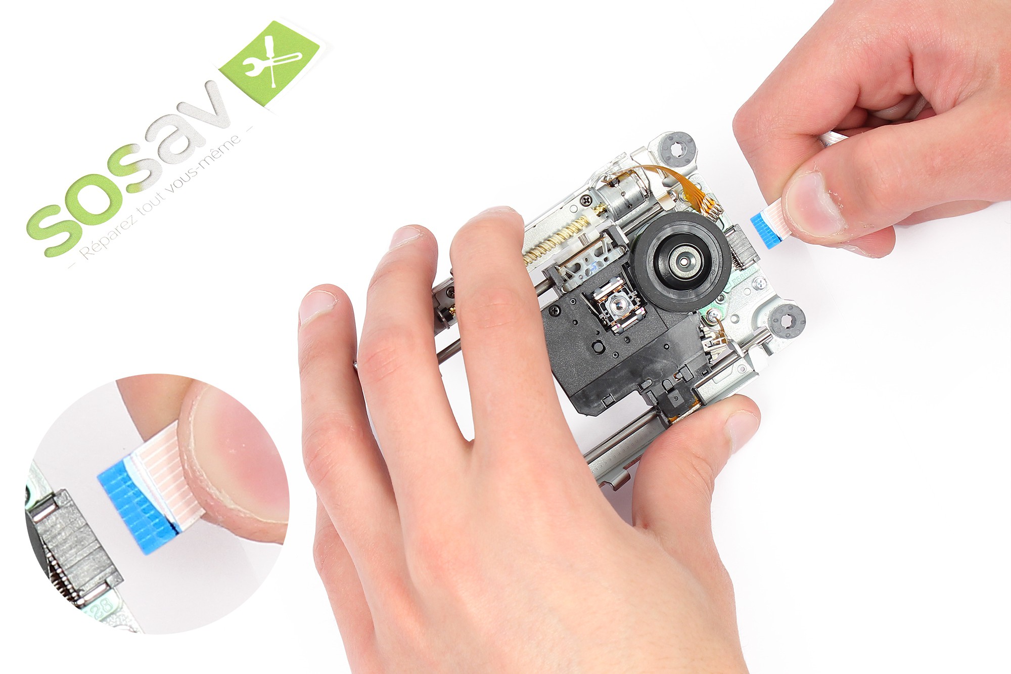 Déconnectez ensuite délicatement la petite nappe de liaisin localisée sur le lecteur Blu-ray.