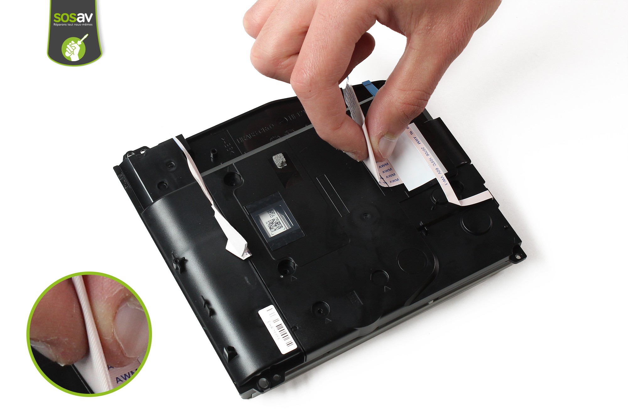 Saisissez la nappe de liaison du moteur d'entrainement du disque et décollez la du cache inférieur sans pour autant retirer totalement la nappe.