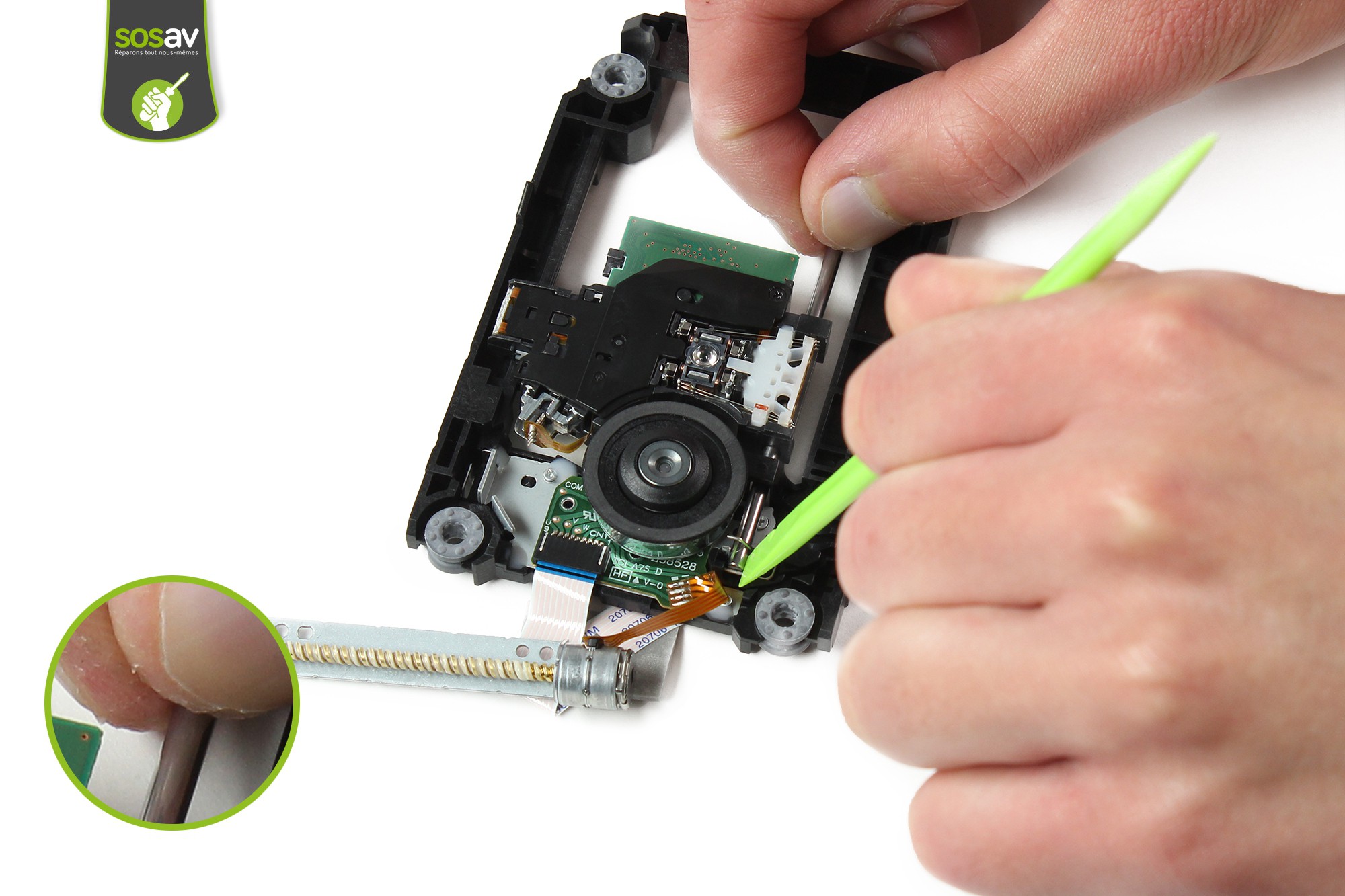Saisissez ensuite la partie bleue de la nappe de liaison du moteur électrique du lecteur optique afin de déconnecter la nappe du moteur de la lentille.Avec la spatule en nylon, déverrouillez ensuite le connecteur de la lentille laser.