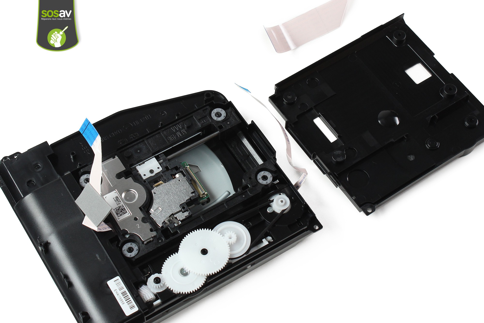 Saisissez ensuite la partie bleue de la nappe de liaison de la lentille et déconnectez la nappe.Puis déconnectez la nappe de liaison du moteur d'entrainement du disque.