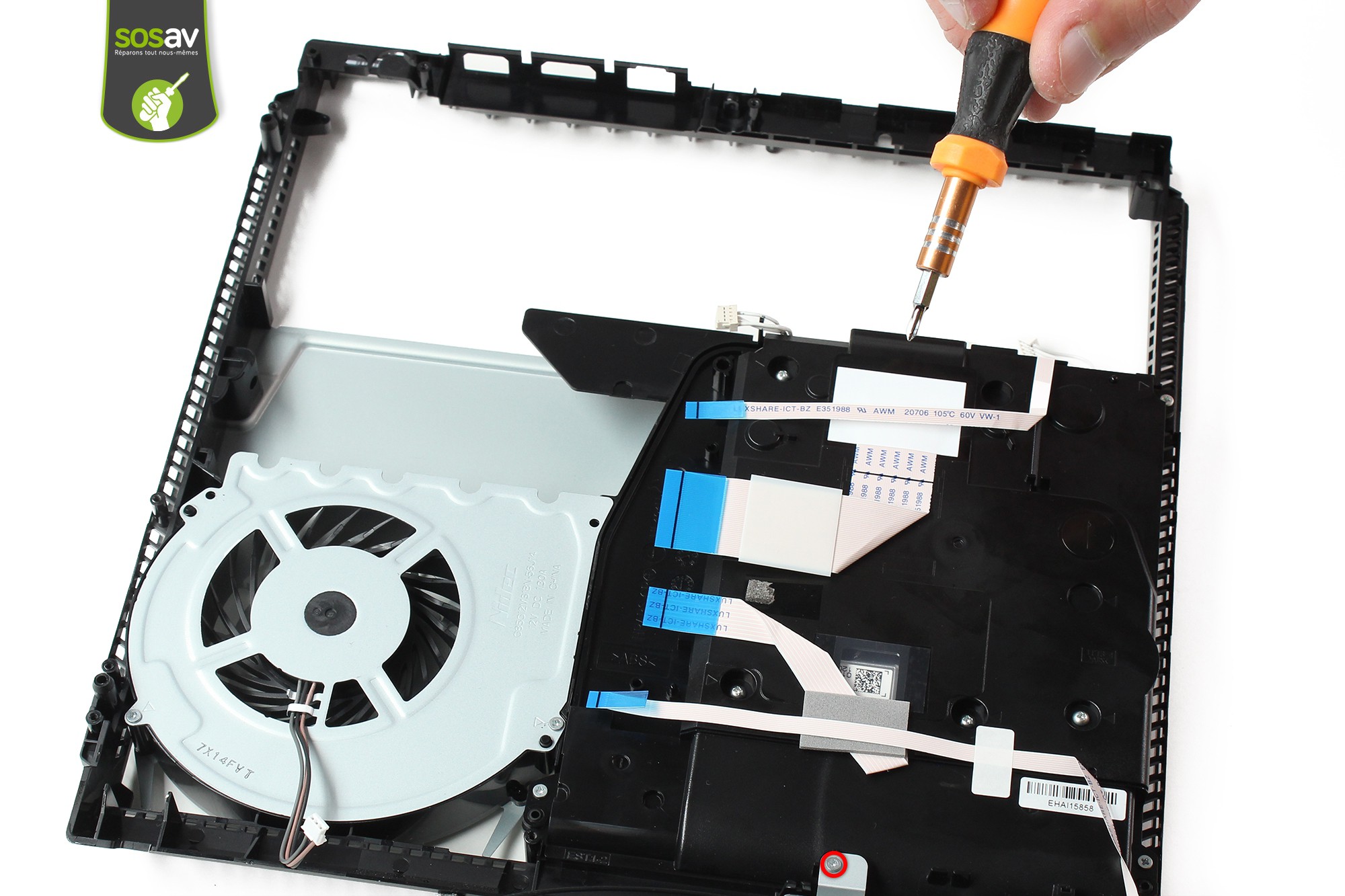 Toujours à l'aide du tournevis cruciforme, dévissez la vis entourée en rouge située du côté opposé de la console.Cette vis maintient l'alimentation.