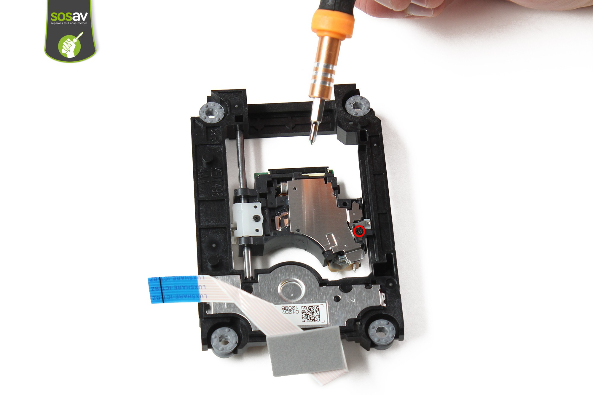 Dévissez ensuite, toujours à l'aide du cruciforme les deux vis entourées en rouge maintenant le moteur du chariot de la lentille laser.
