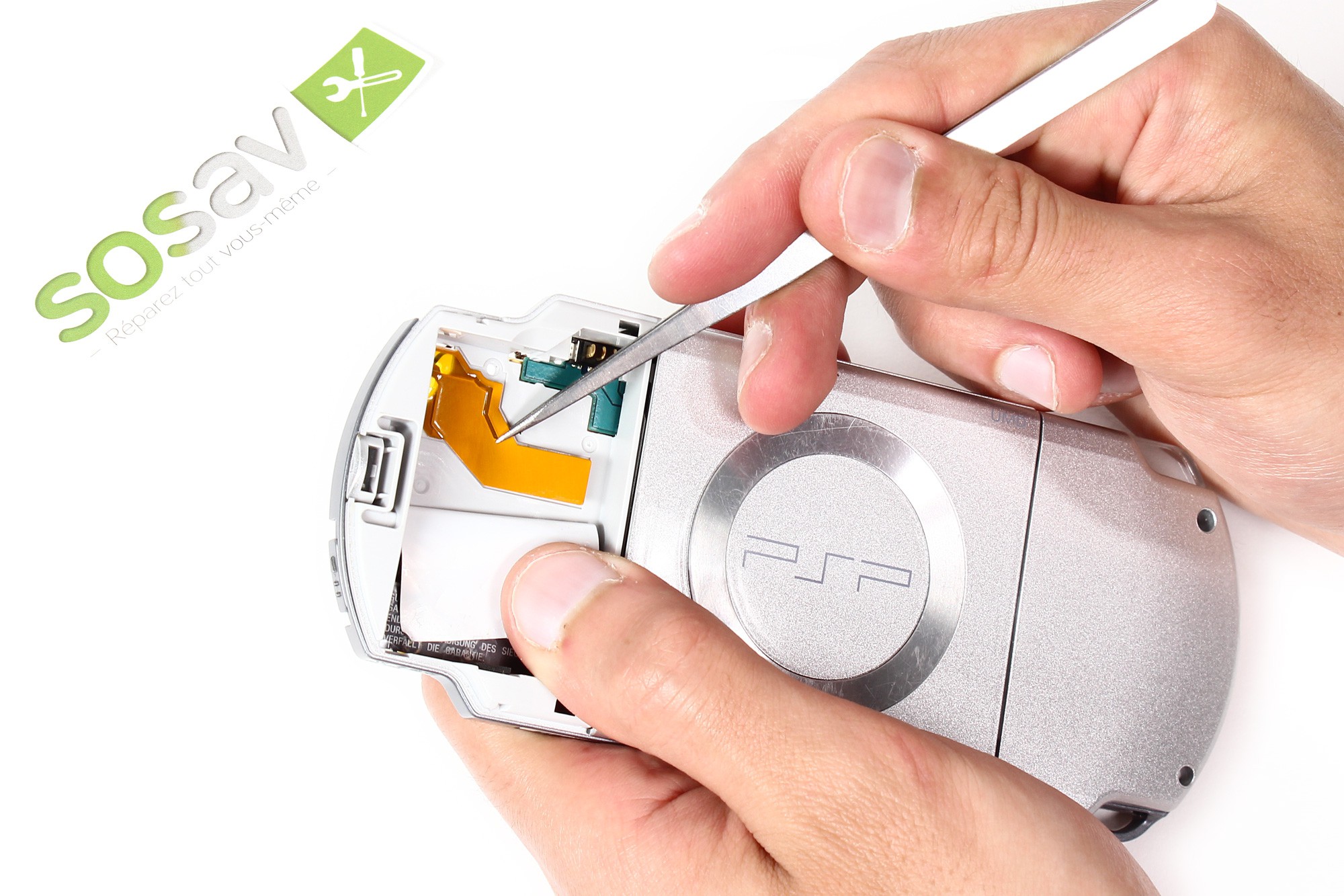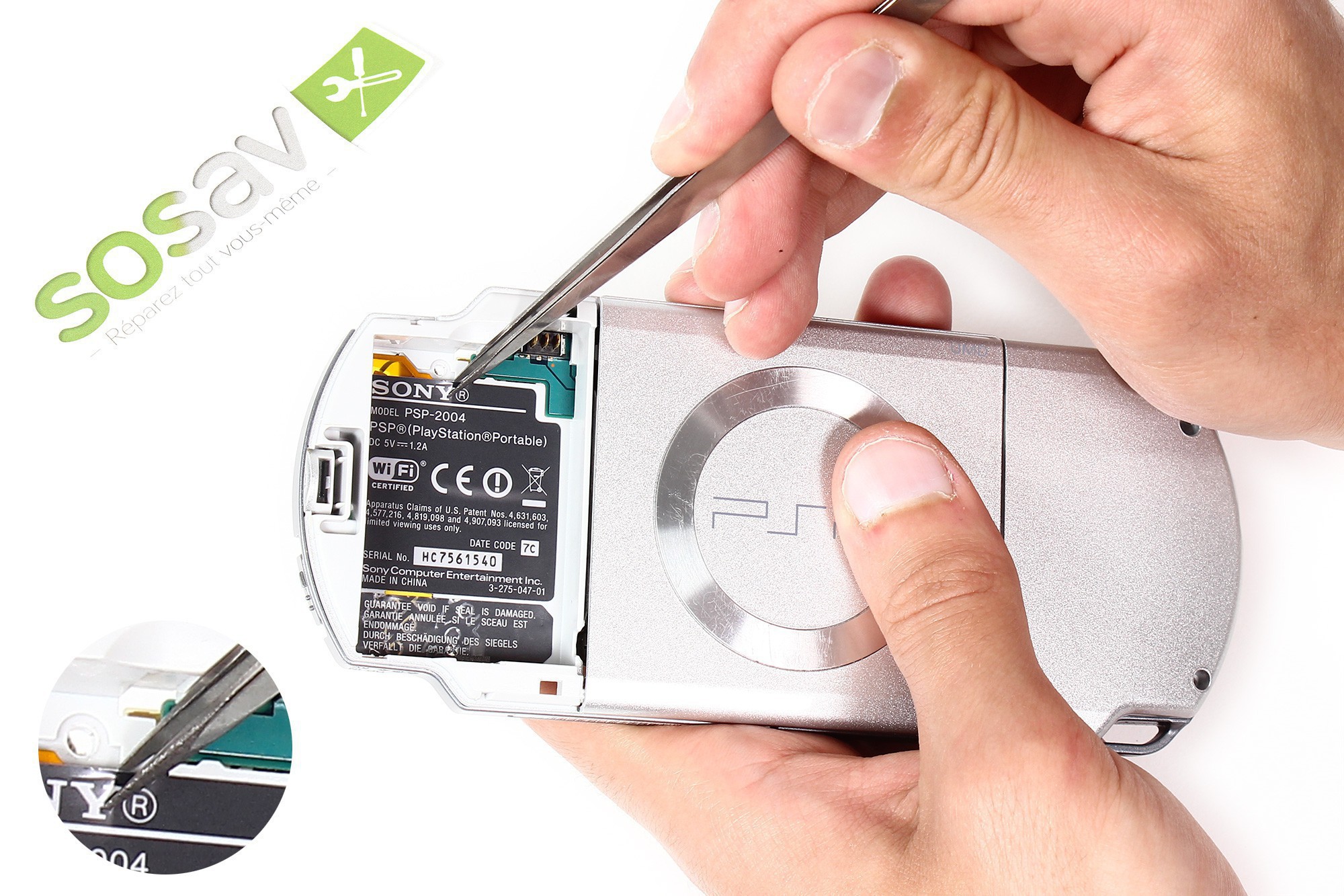 A l’aide d’une pince, décollez délicatement l’étiquette de garantie située sur la partie inférieur du logement de la batterie de la PSP 2000.