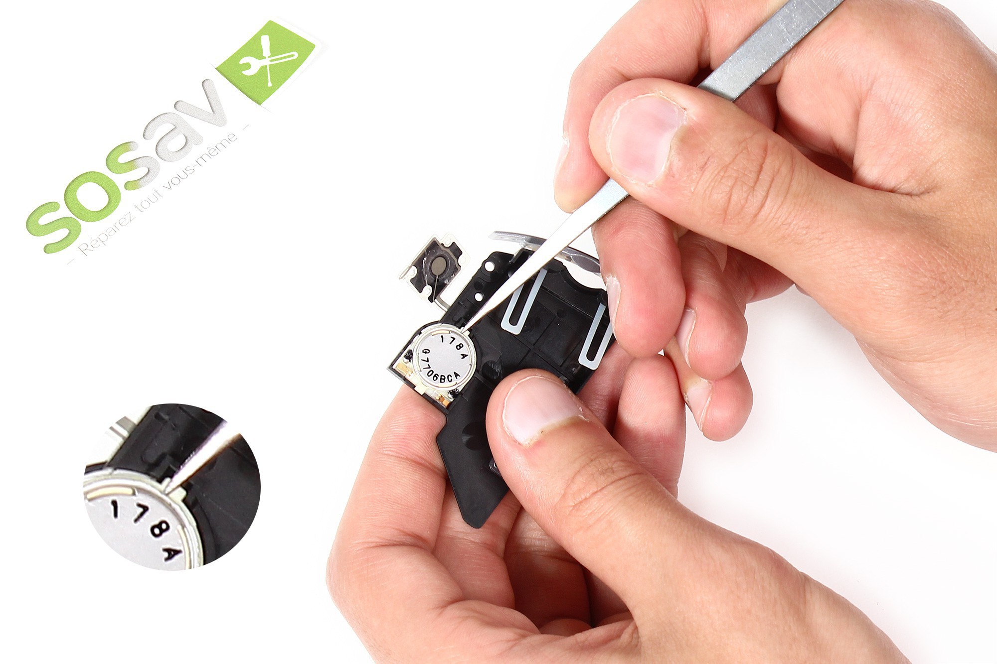 A l’aide de la pince, déclipsez le haut-parleur gauche de la carte complète puis procédez à son retrait.