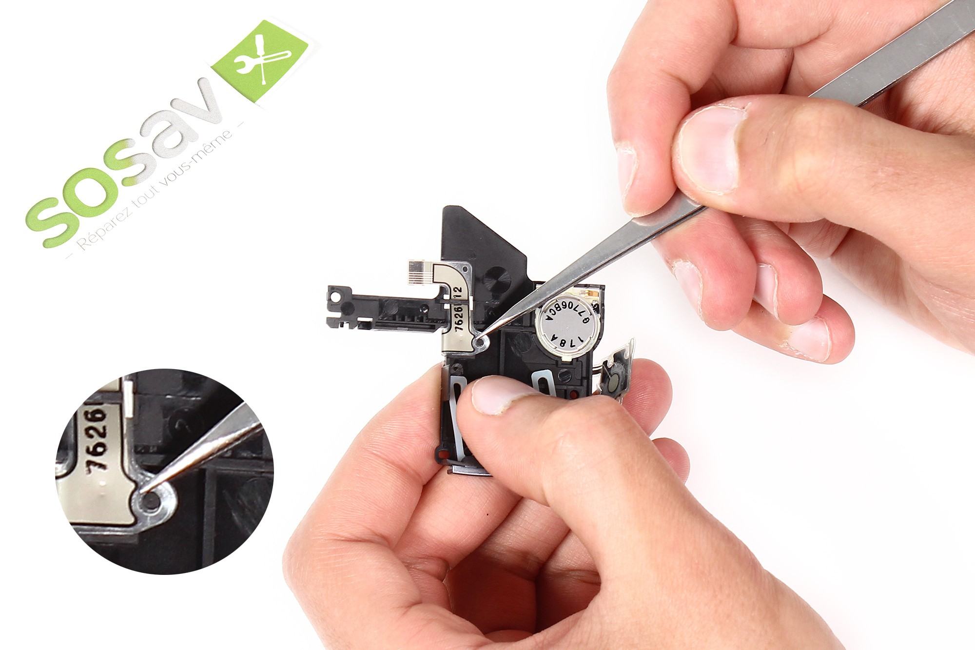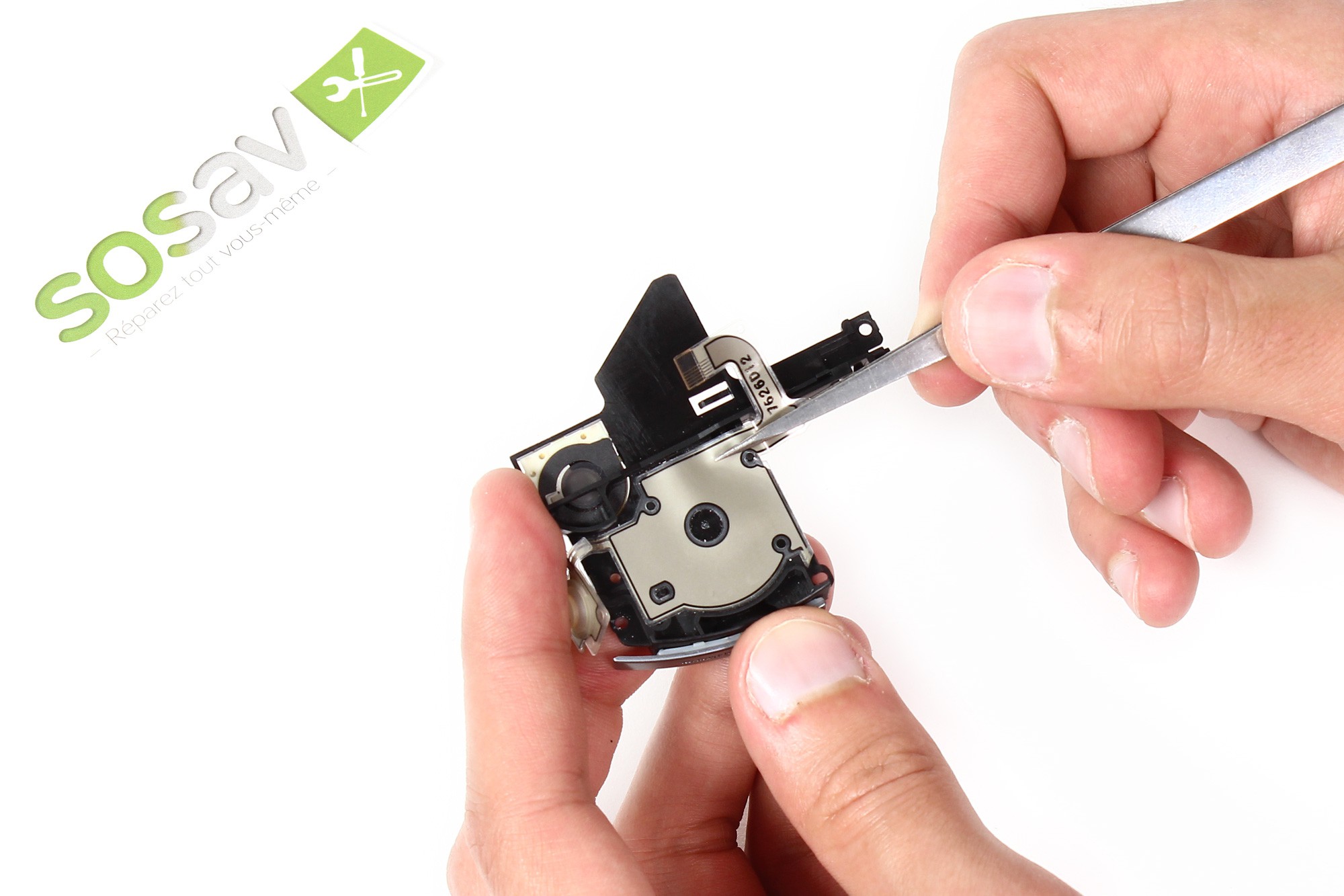 Utilisez désormais une pince afin de saisir la nappe L et son support.