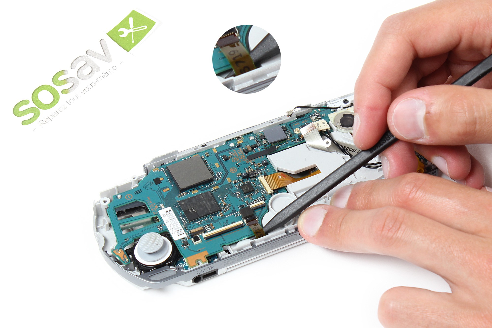 A l'aide de la pointe d'une spatule en nylon, procédez au retrait de la nappe d'alimentation du moteur du lecteur UMD.