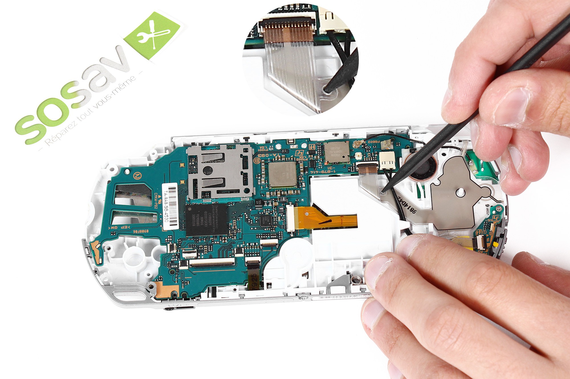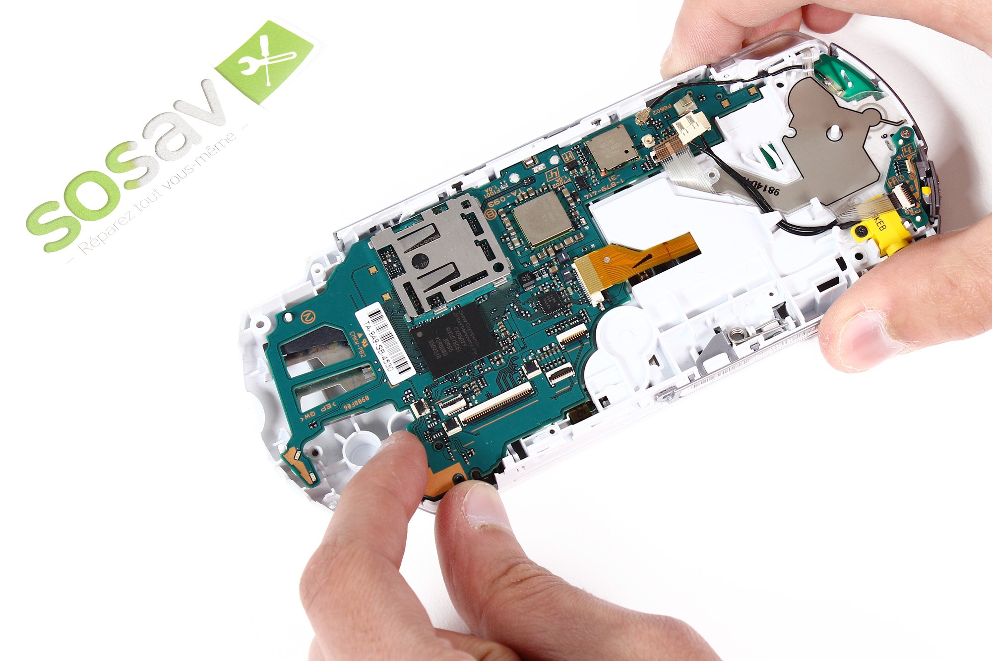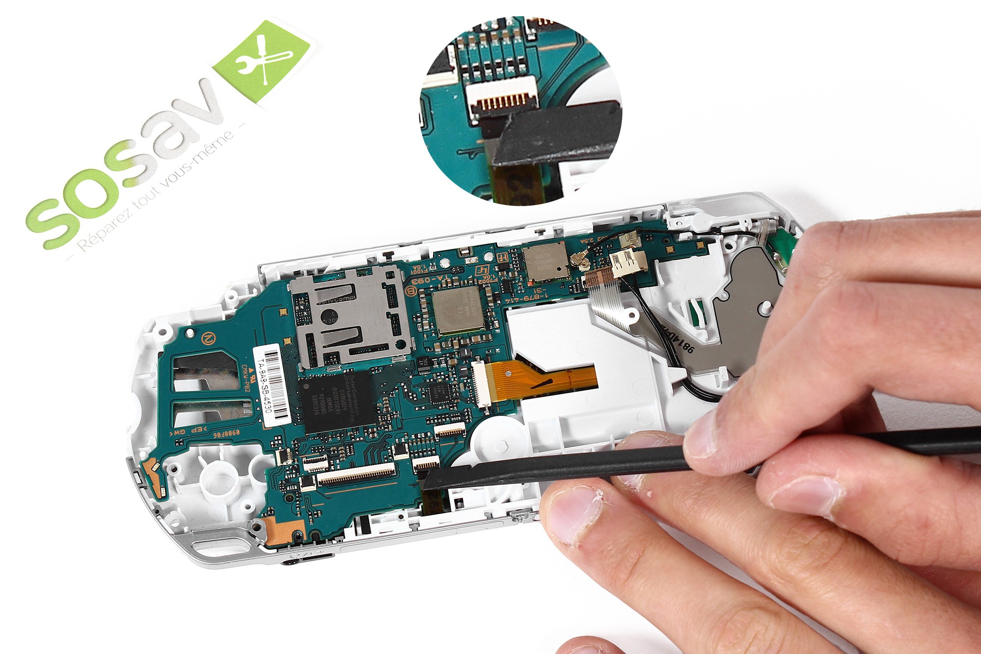 Note : Ne retirez toujours pas l’écran à ce stade. Il est encore rattaché par 2 nappes à la carte mère de la PSP 3000.