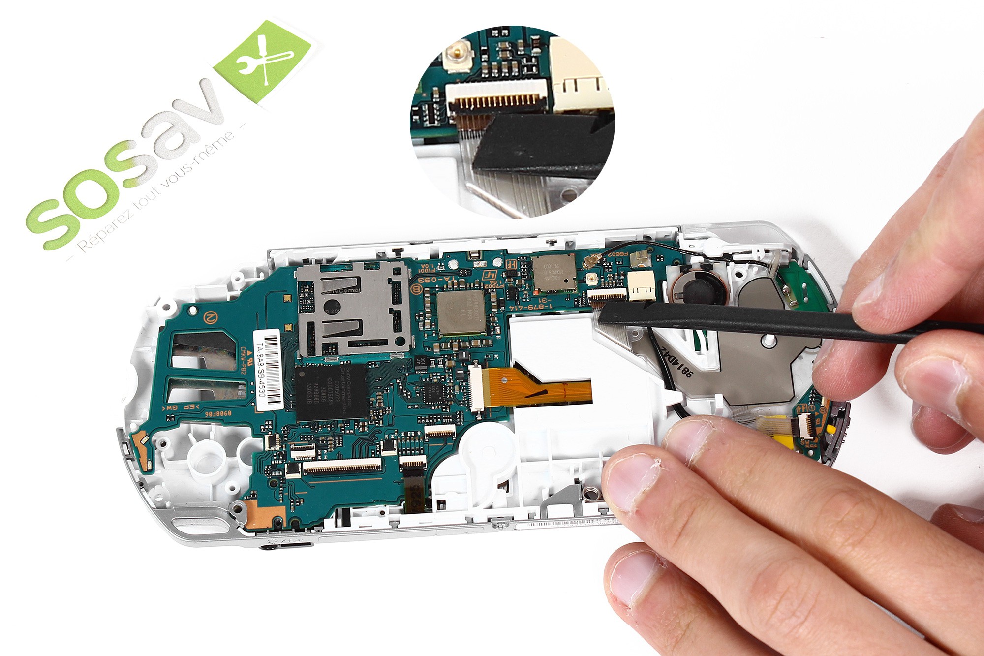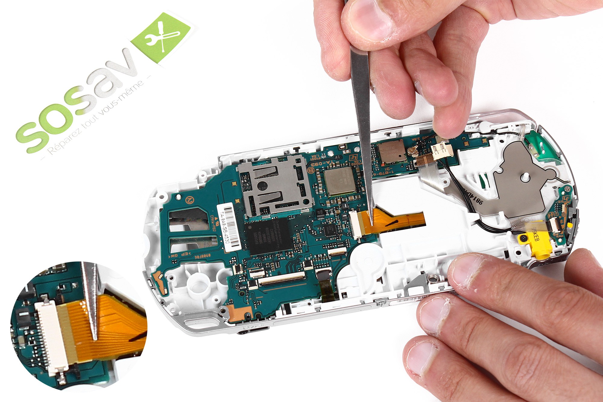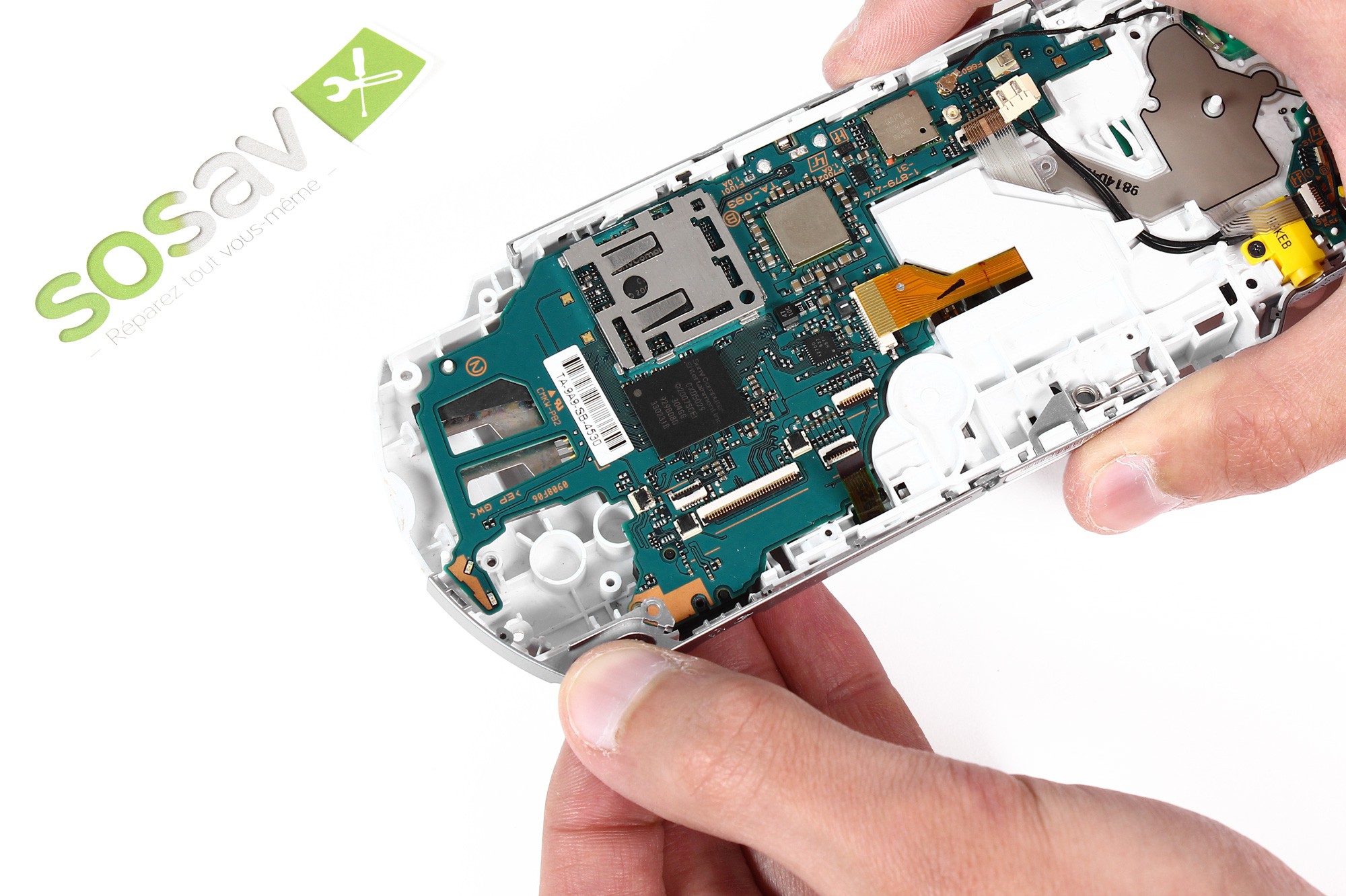 Note : Ne retirez toujours pas l’écran à ce stade. Il est encore rattaché par 2 nappes à la carte mère de la PSP 3000.