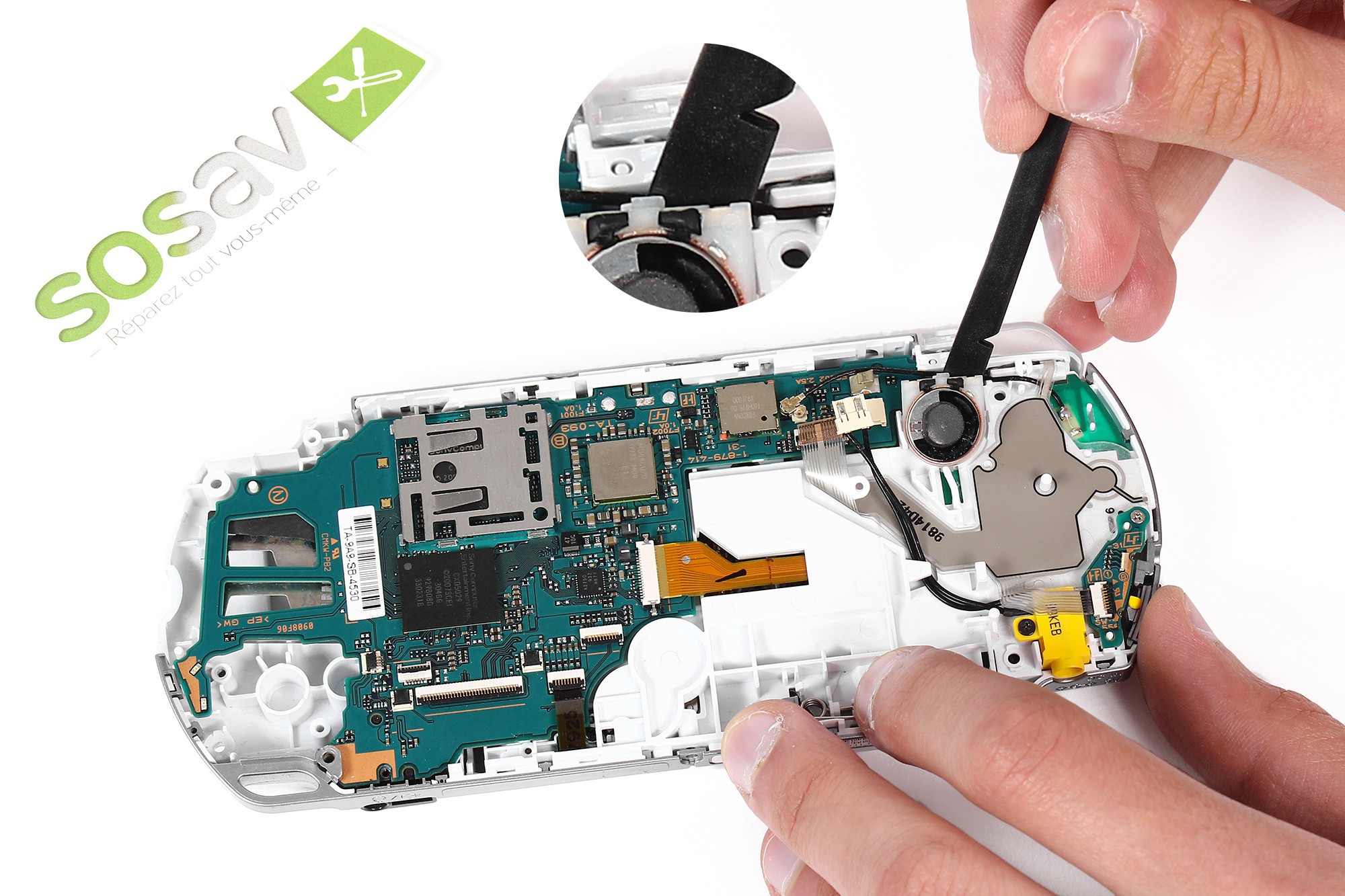 A l'aide d'une spatule en nylon, déclipsez le haut-parleur droit de la PSP-3000.