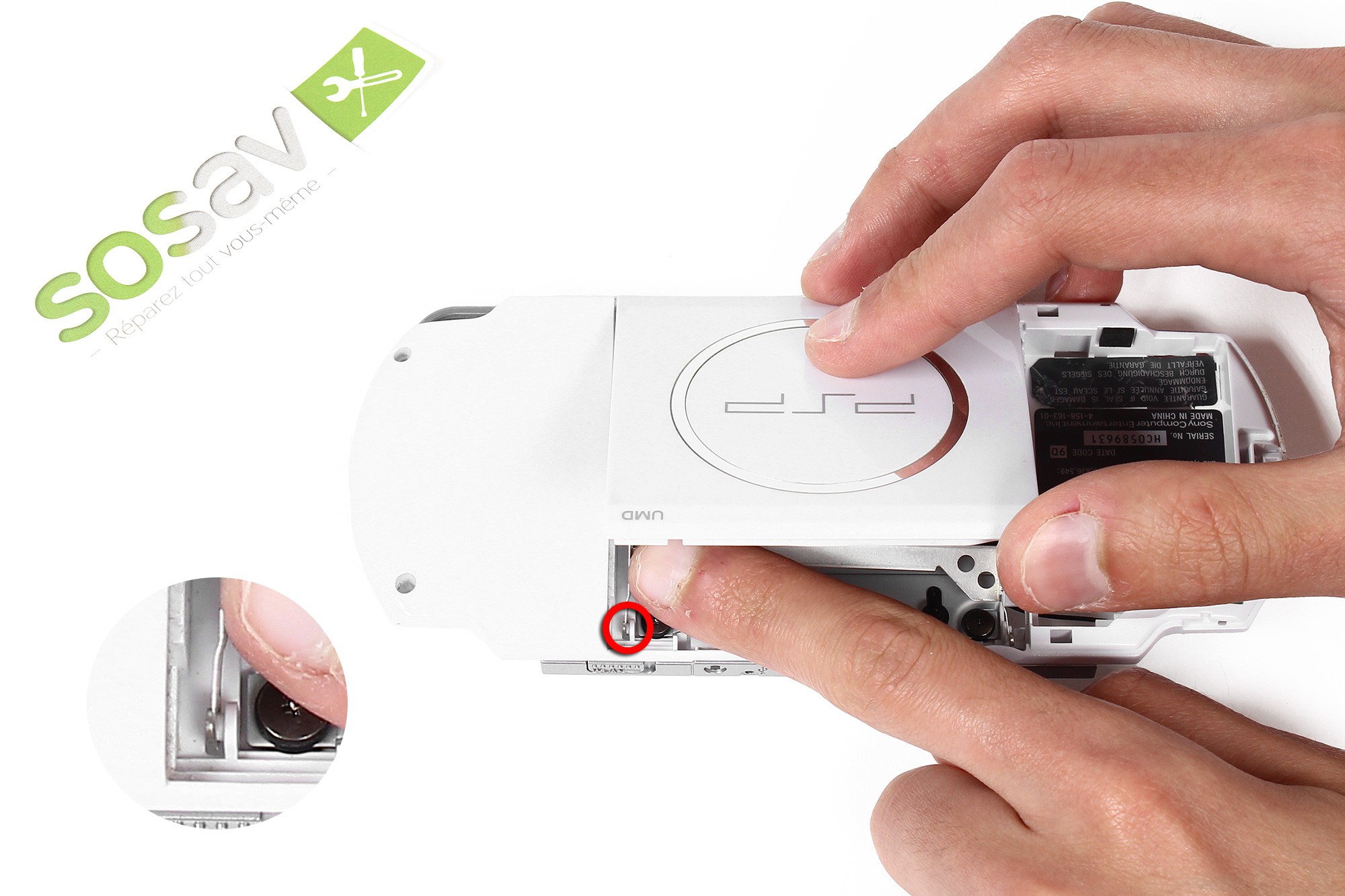 Retournezdésormais la console et ouvrez le capot du lecteur UMD.