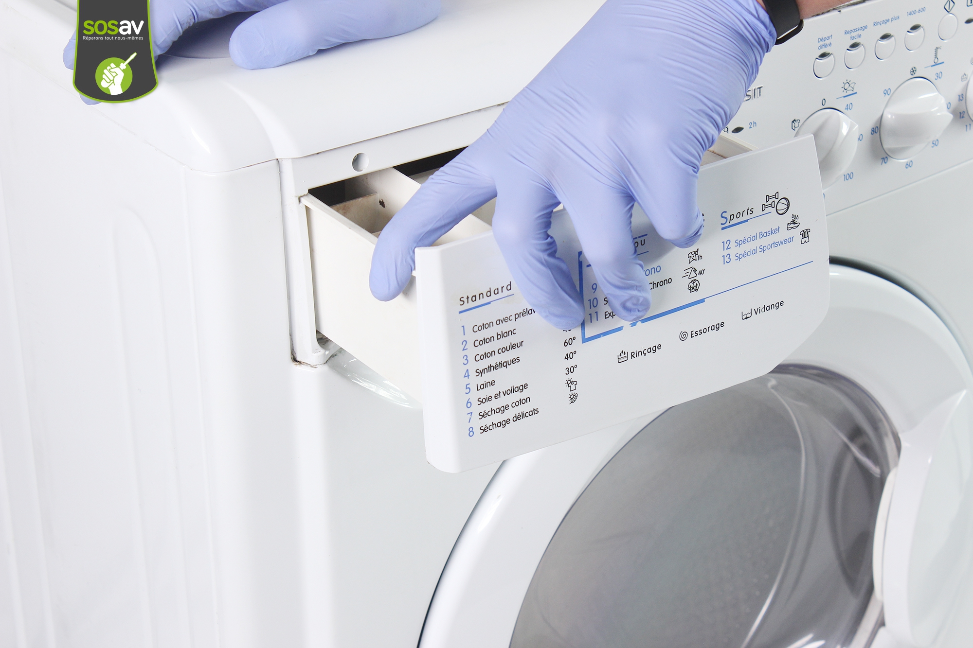A force de faire des lessives, il est possible que le tiroir se salisse. Ou alors, il peut se casser suite à une mauvaise manipulation. Mais rassurez-vous, il est possible de le retirer et de le remplacer facilement ! Il suffit de suivre les conseils des experts de SOSav dans ce guide de réparation illustré et commenté afin de savoir comment changer son tiroir à lessive de machine à laver.