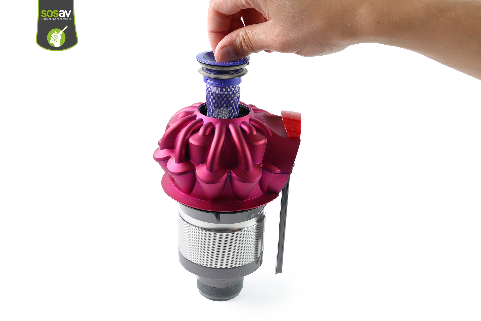 La technologie cyclone du Dyson V7 Trigger ne fonctionne plus correctement ? Plus rien ne se passe quand vous allumez votre aspirateur et même si le moteur tourne, la poussière n'est plus aspirée ? Pas de panique car les experts de SOSav sont là pour vous expliquer comment changer votre cyclone Dyson V7 Trigger dans ce guide de réparation entièrement gratuit. Toutes les étapes sont illustrées et commentées pour vous détailler au mieux les manipulations à réaliser afin de changer le cyclone Dyson V7 défaillant. Vous n'aurez pas à racheter un nouvel aspirateur et ferez donc des économies ! Il vous suffit de suivre nos indications dans ce tuto afin de savoir comment faire.
