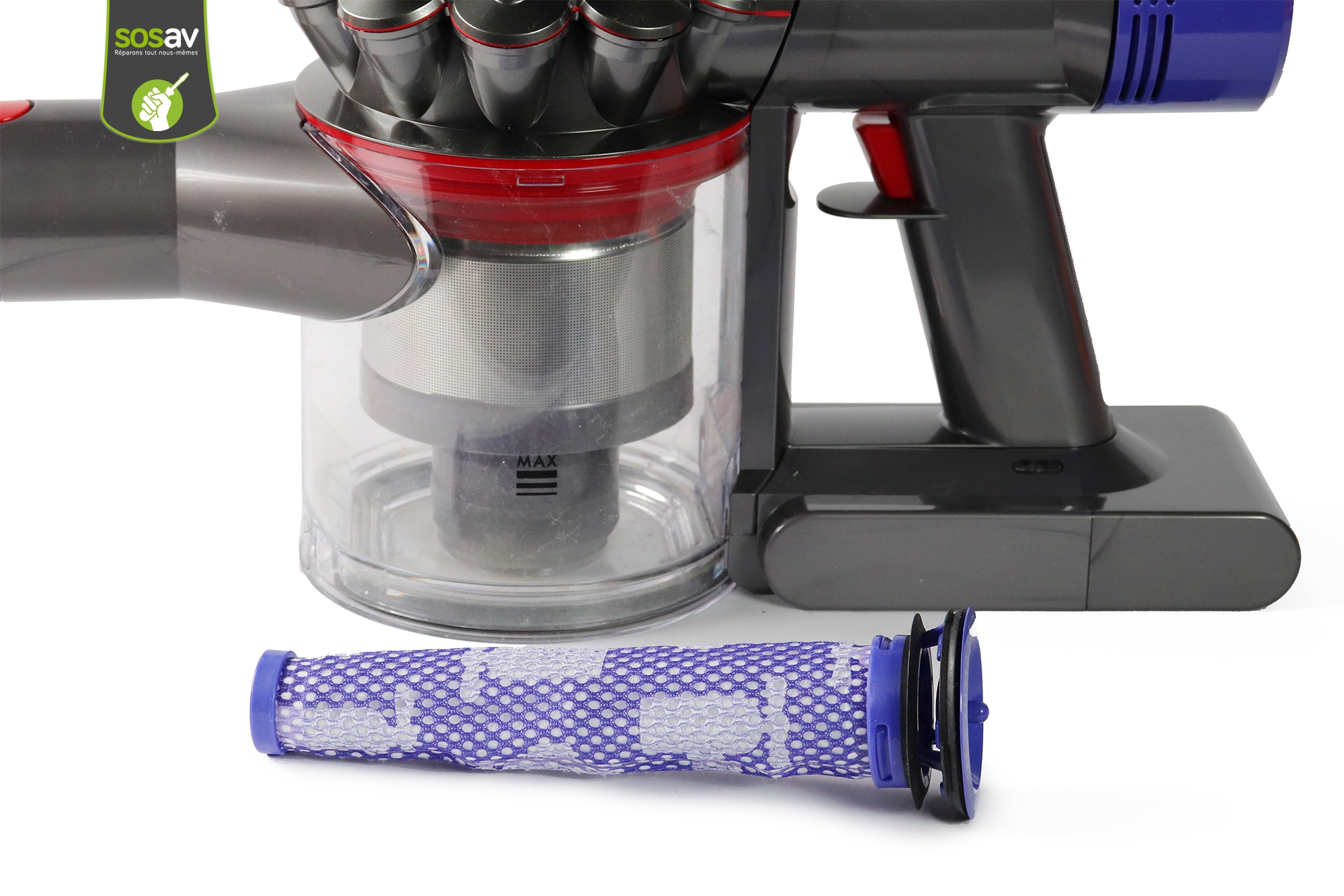 Trop de poussière s'est accumulée dans votre filtre cyclone Dyson V8 Absolute ? Le filtre est encrassé et vous devez le nettoyer ou carrément le changer ? Cela fait partie de l'entretien classique d'un aspirateur et les experts de SOSav vous expliquent comment changer ce filtre cyclone vous-même à travers les étapes illustrées et détaillées de ce guide de réparation. Vous verrez que la manoeuvre est très simple !