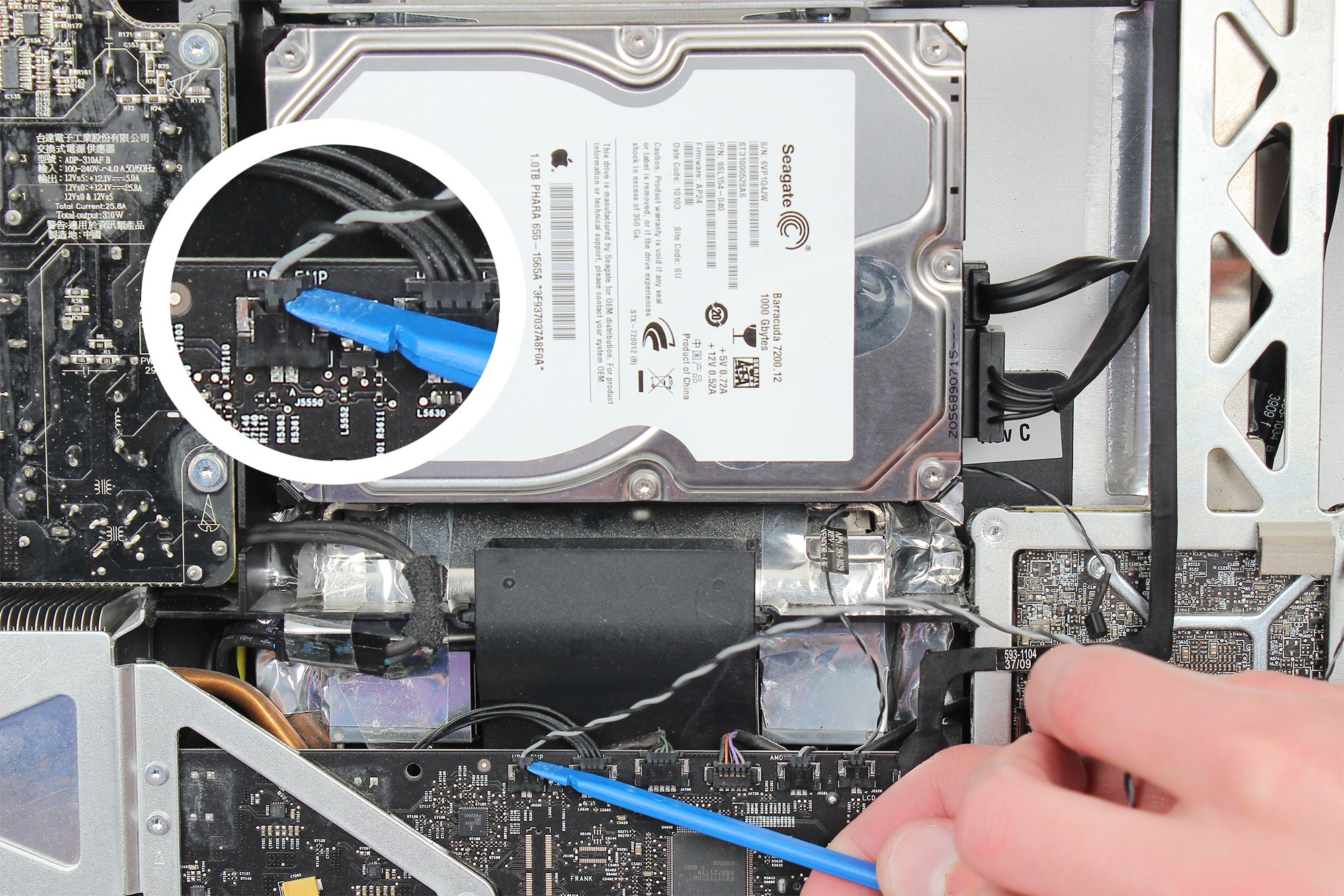 Le disque dur se situe au centre de l'iMac comme indiqué sur la photo.