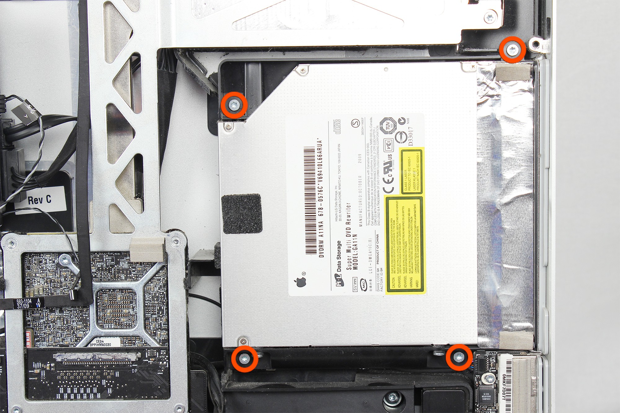 Dévissez et retirez ensuite les 4 vis au format Torx T10 qui mantiennent le lecteur SuperDrive au châssis de l'iMac.