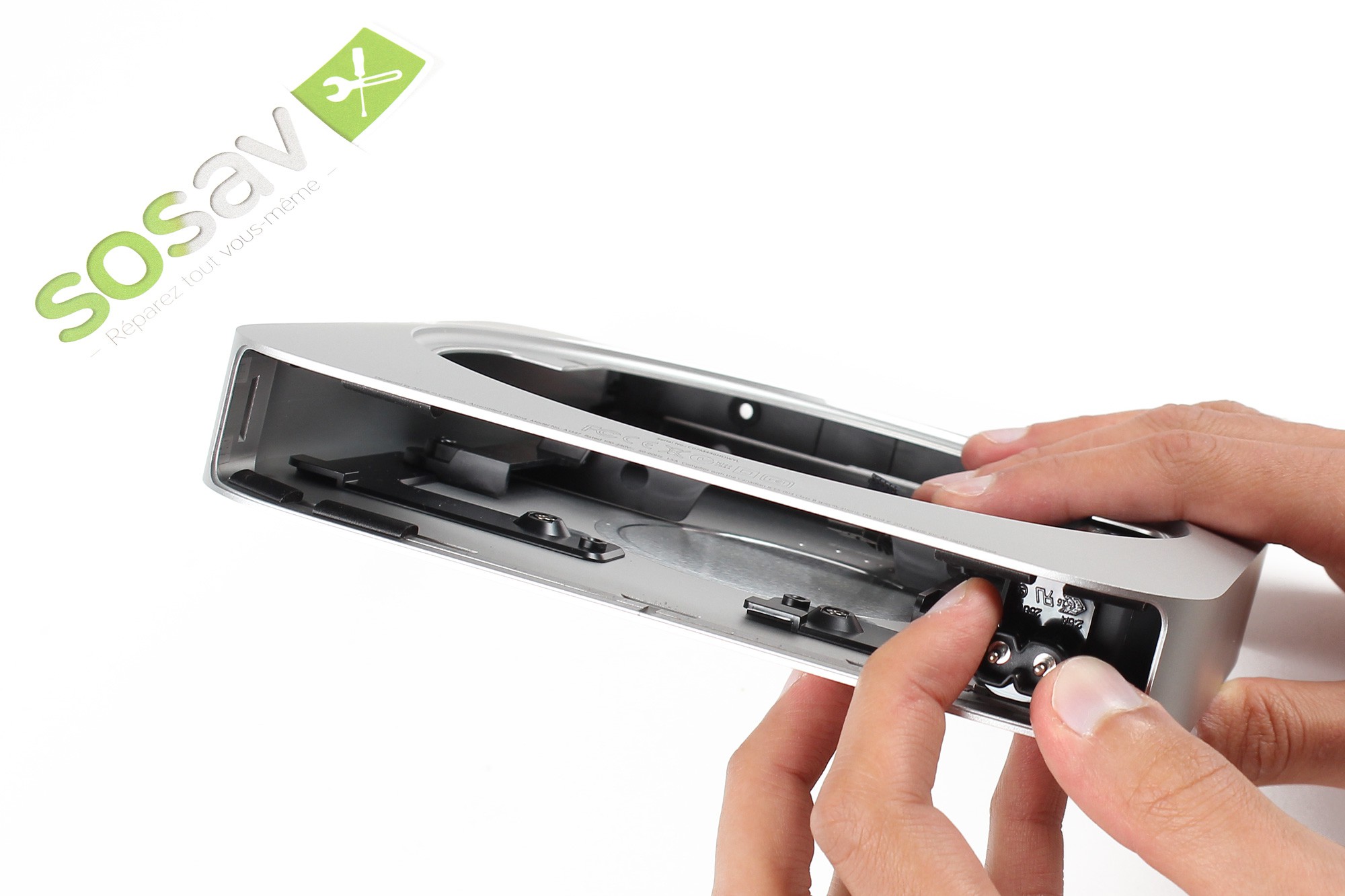 Conseil : Ne perdez pas cette petite pièce ! Elle vous sera nécessaire lors du remontage, ce taquet servant à maintenir la prise d'alimentation parfaitement droite.