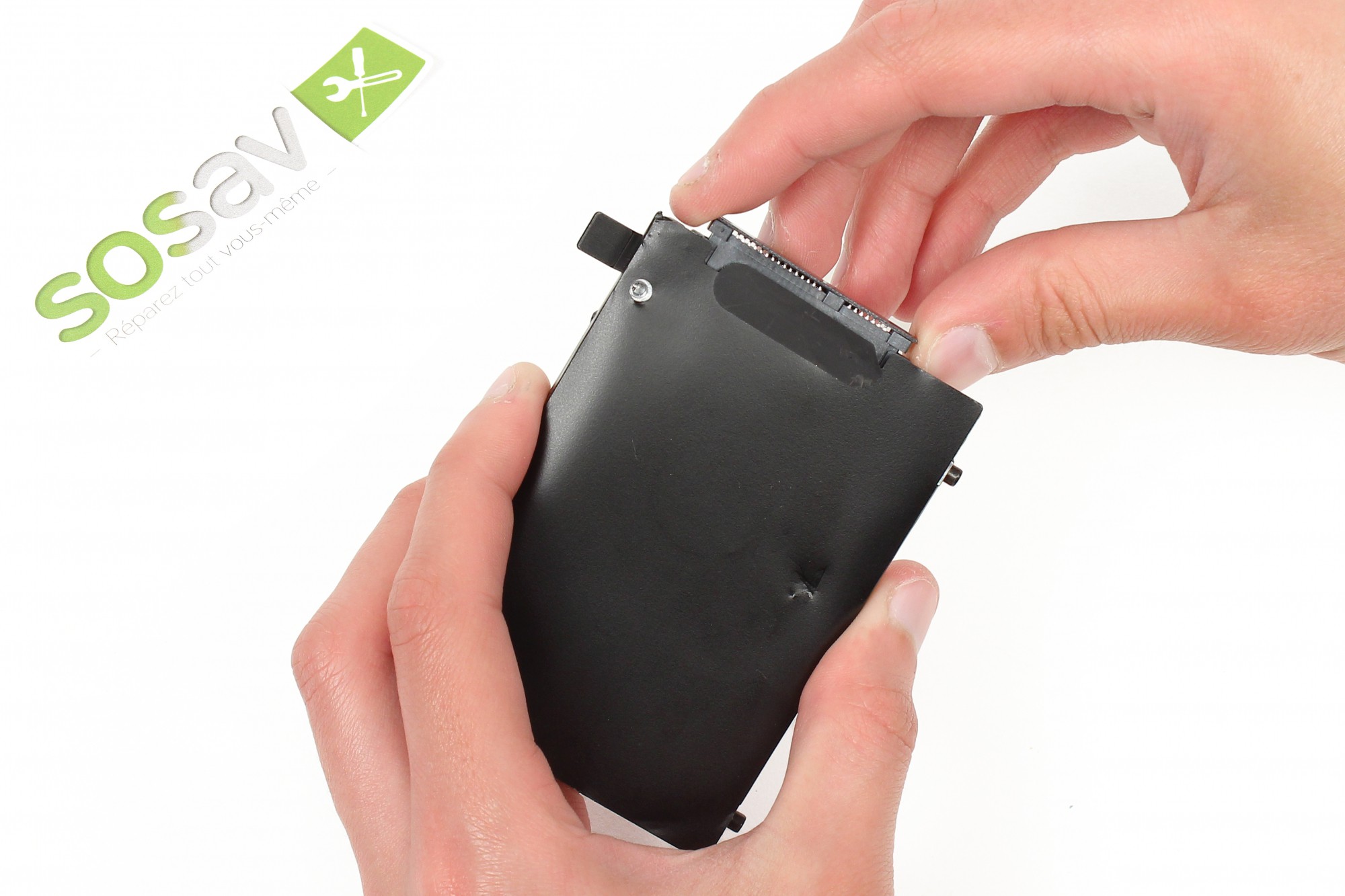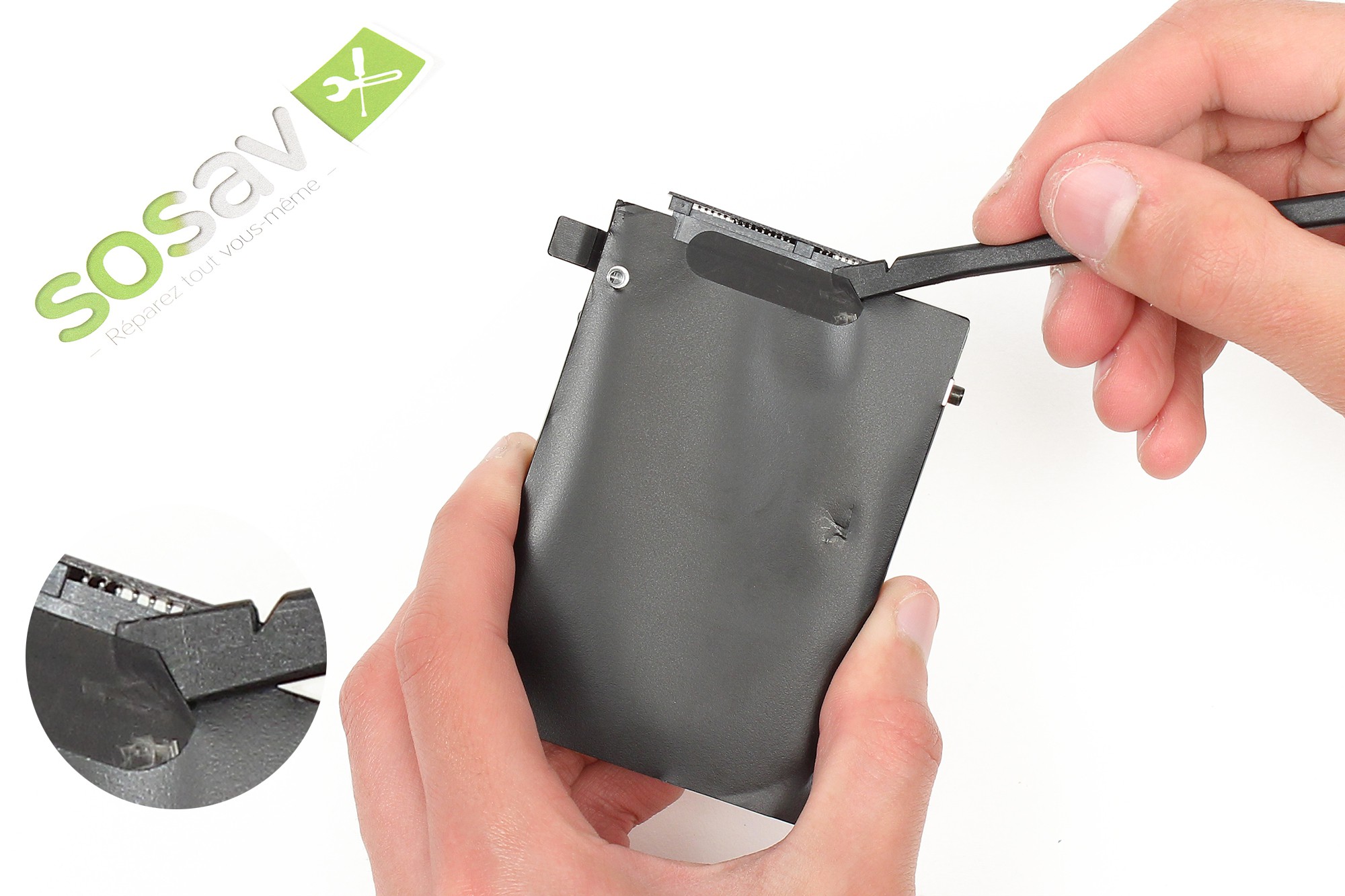 Toujours avec cette spatule en nylon, décollez le petit adhesif noir localisé sous le disque dur et collé sur une partie du connecteur de données et d'alimentation.
