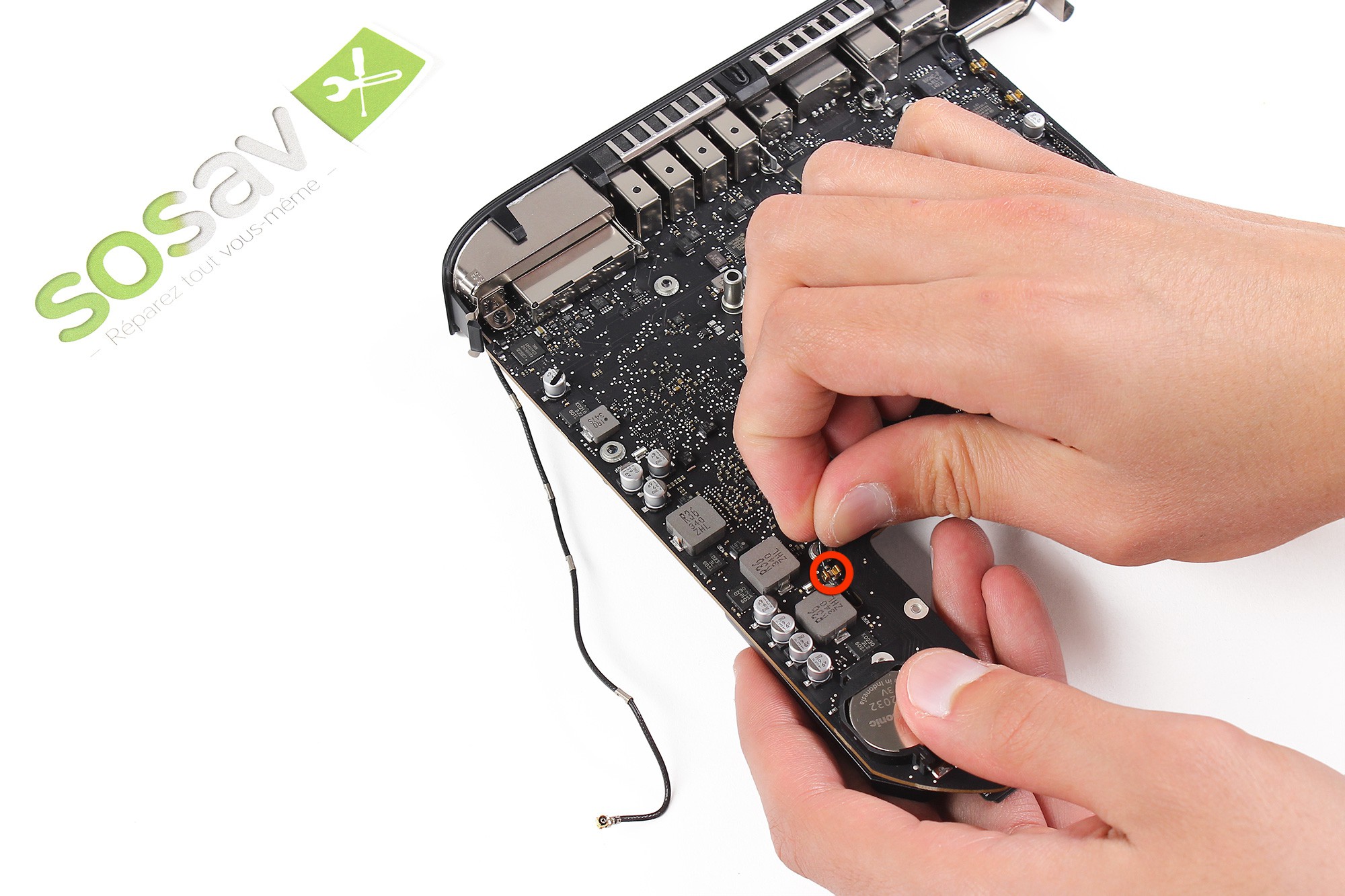 Insérez l'outil spécial de démontage dans les deux trous présents sur la carte mère, entourés en rouge sur la photo.
