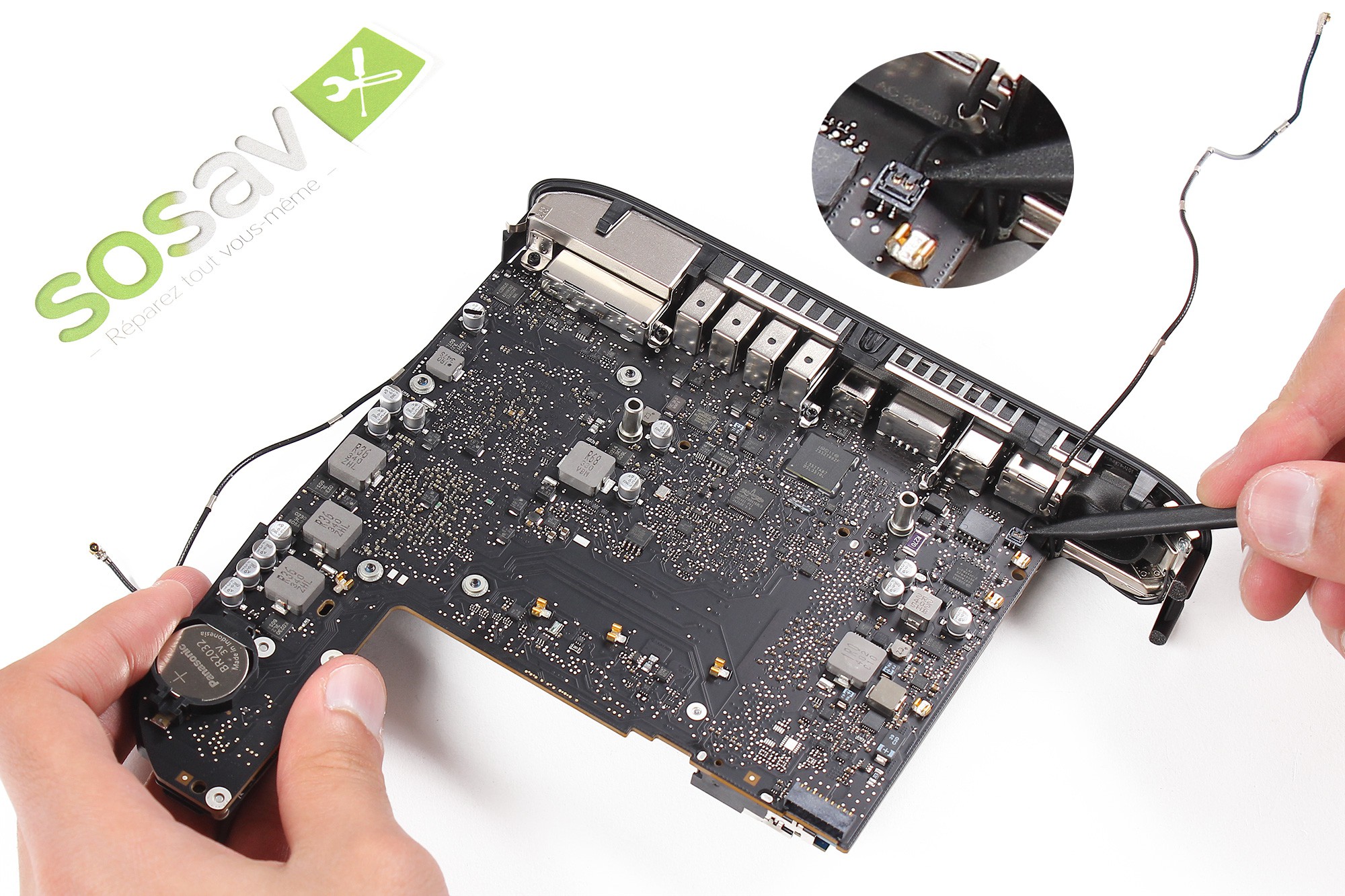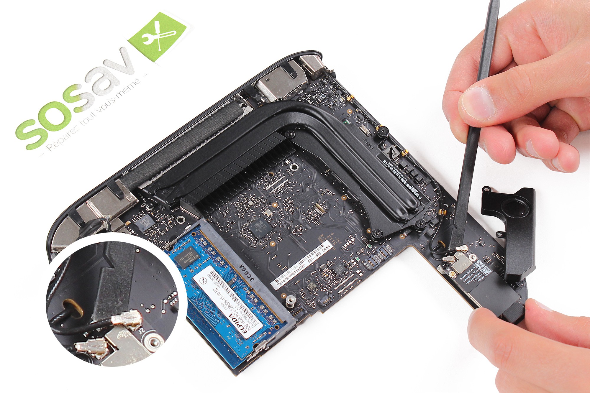 Utilisez une spatule en nylon afin de déconnecter délicatement les deux antennes de la carte WiFi/Bluetooth.
