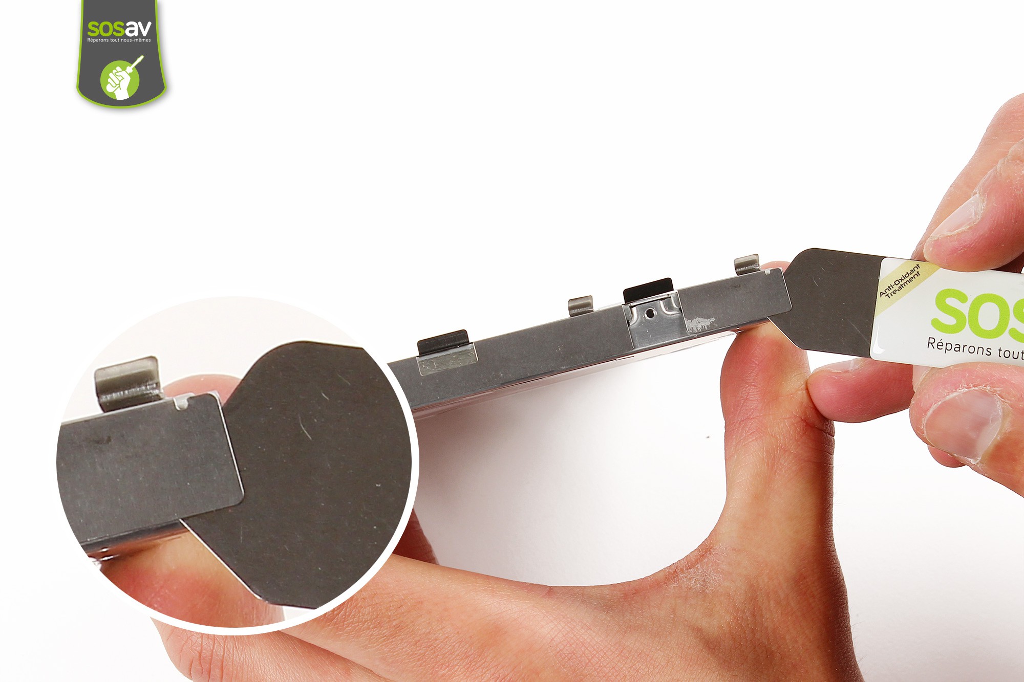 A l'aide de la spatule en nylon, décollez délicatement l'antenne Bluetooth de son support.