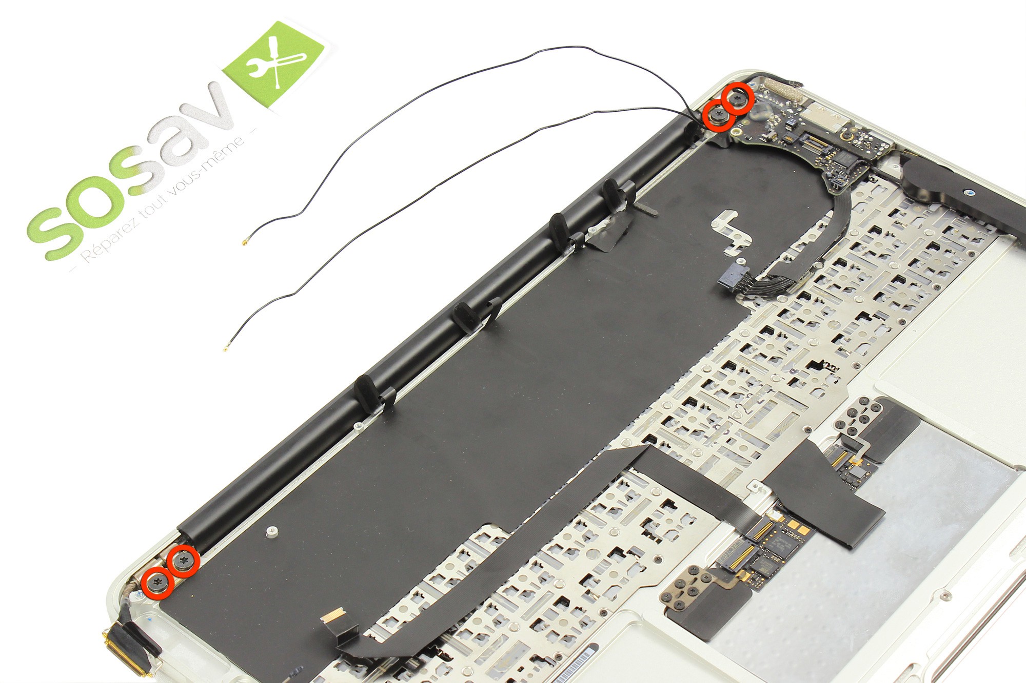 Utilisez une spatule en nylon, pour délicatement faire levier, afin de déconnecter les 2 antennes reliées à la carte Airport (WiFi & Bluetooth).