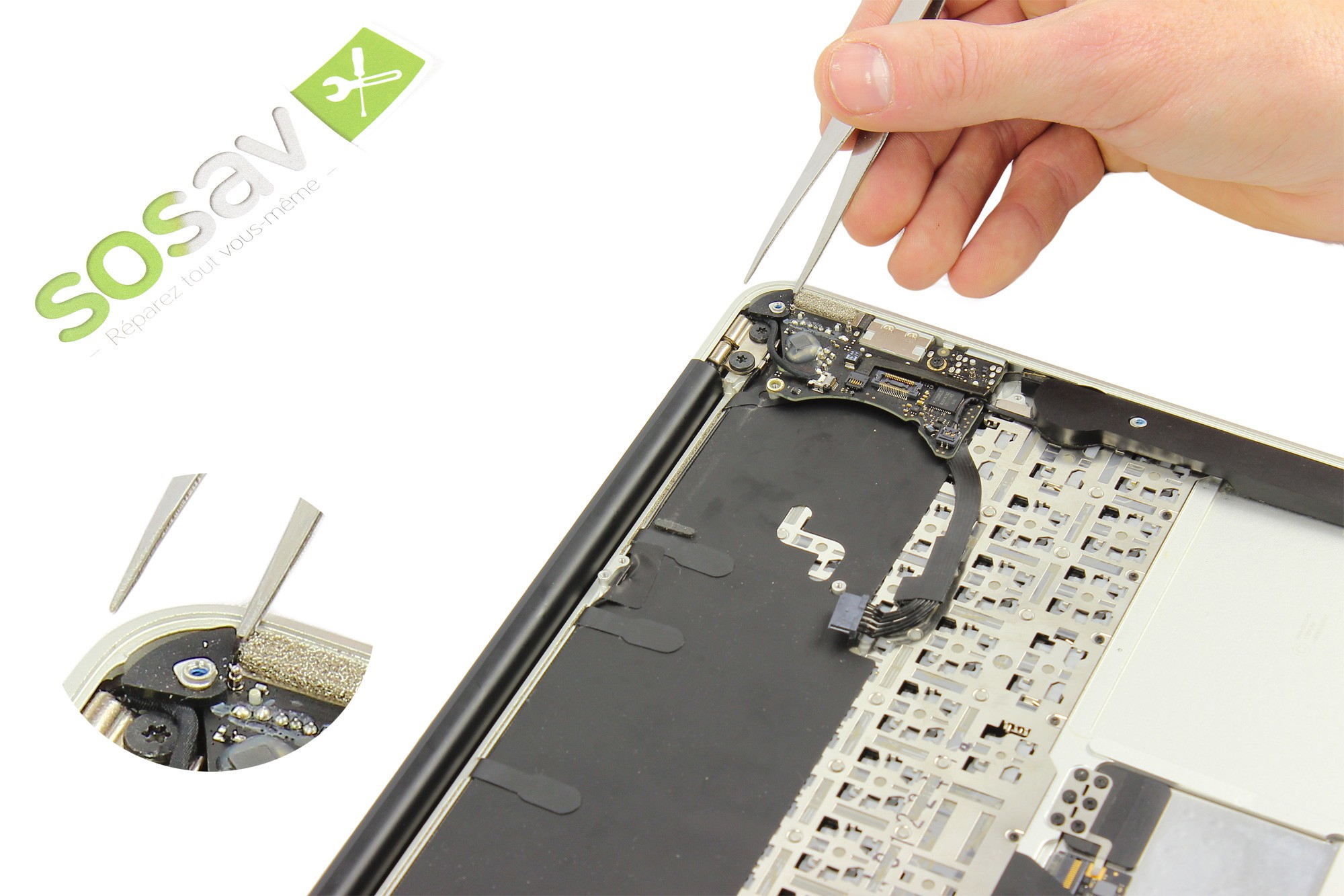 A l'aide d'une pince, venez saisir la pièce de caoutchouc situé dans l'angle supérieur droit de votre MacBook air.