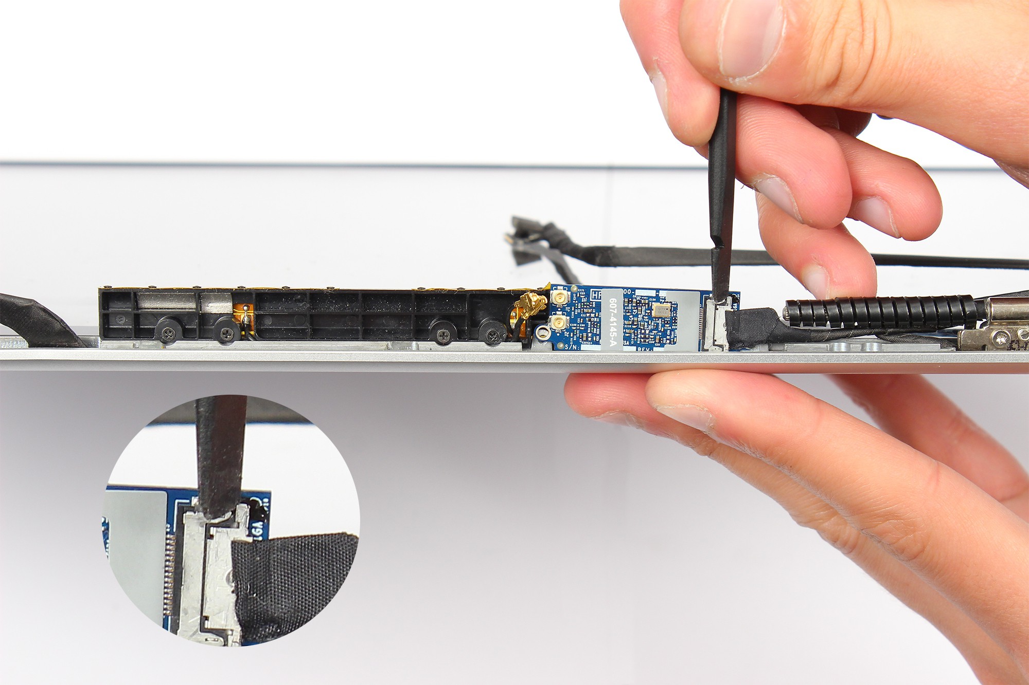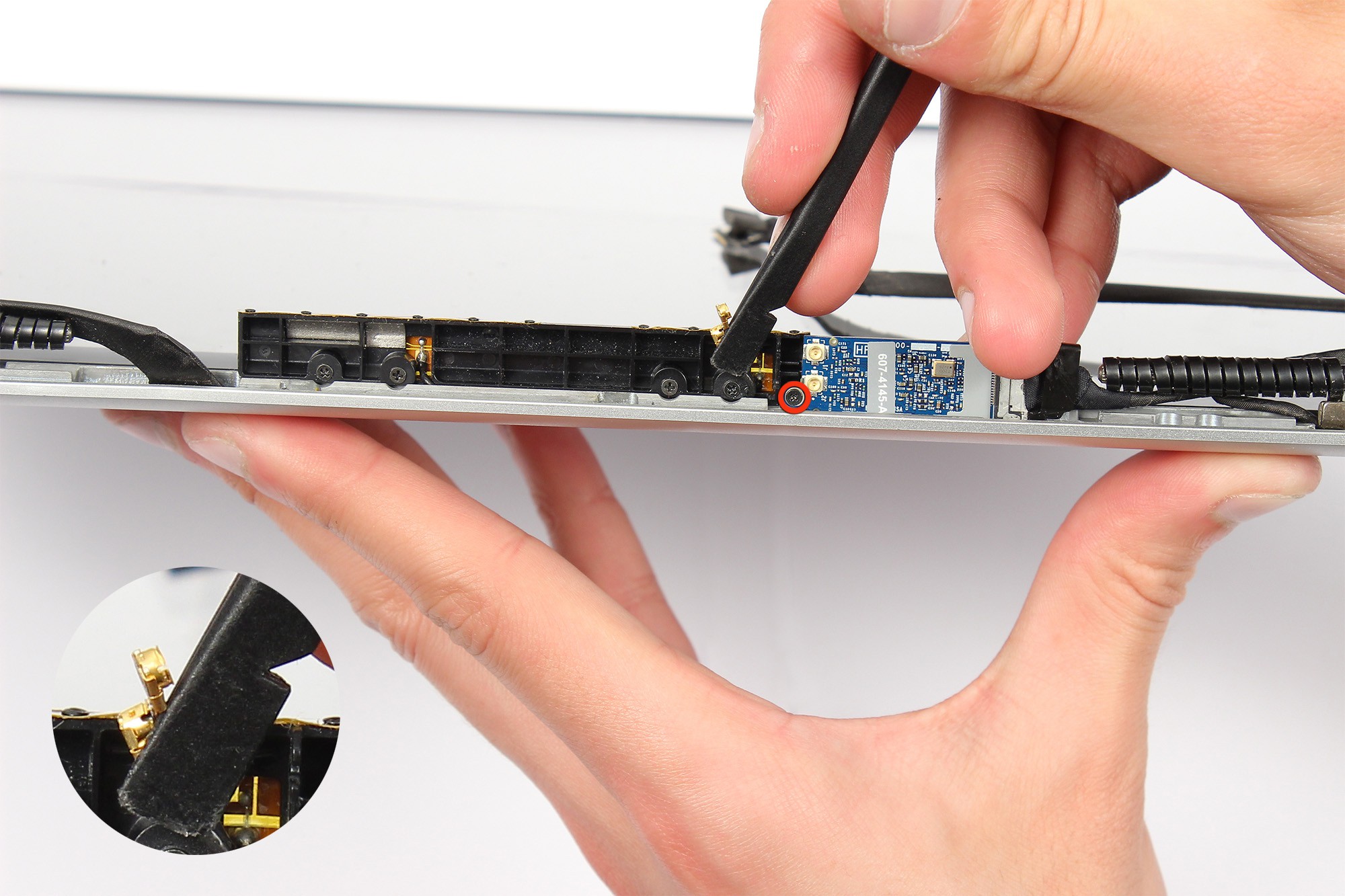 A l'aide d'une spatule en nylon, déconnectez délicatement les deux antennes de la carte AirPort.