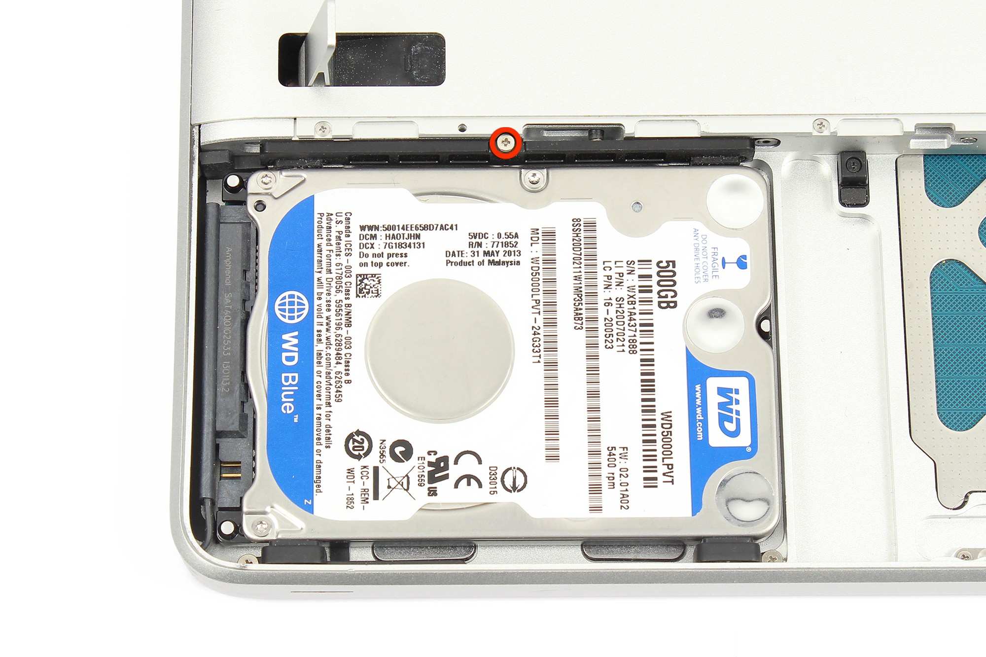 Insérez une spatule en nylon dans l'interstice en haut afin de faire levier et extraire le disque dur de son logement.