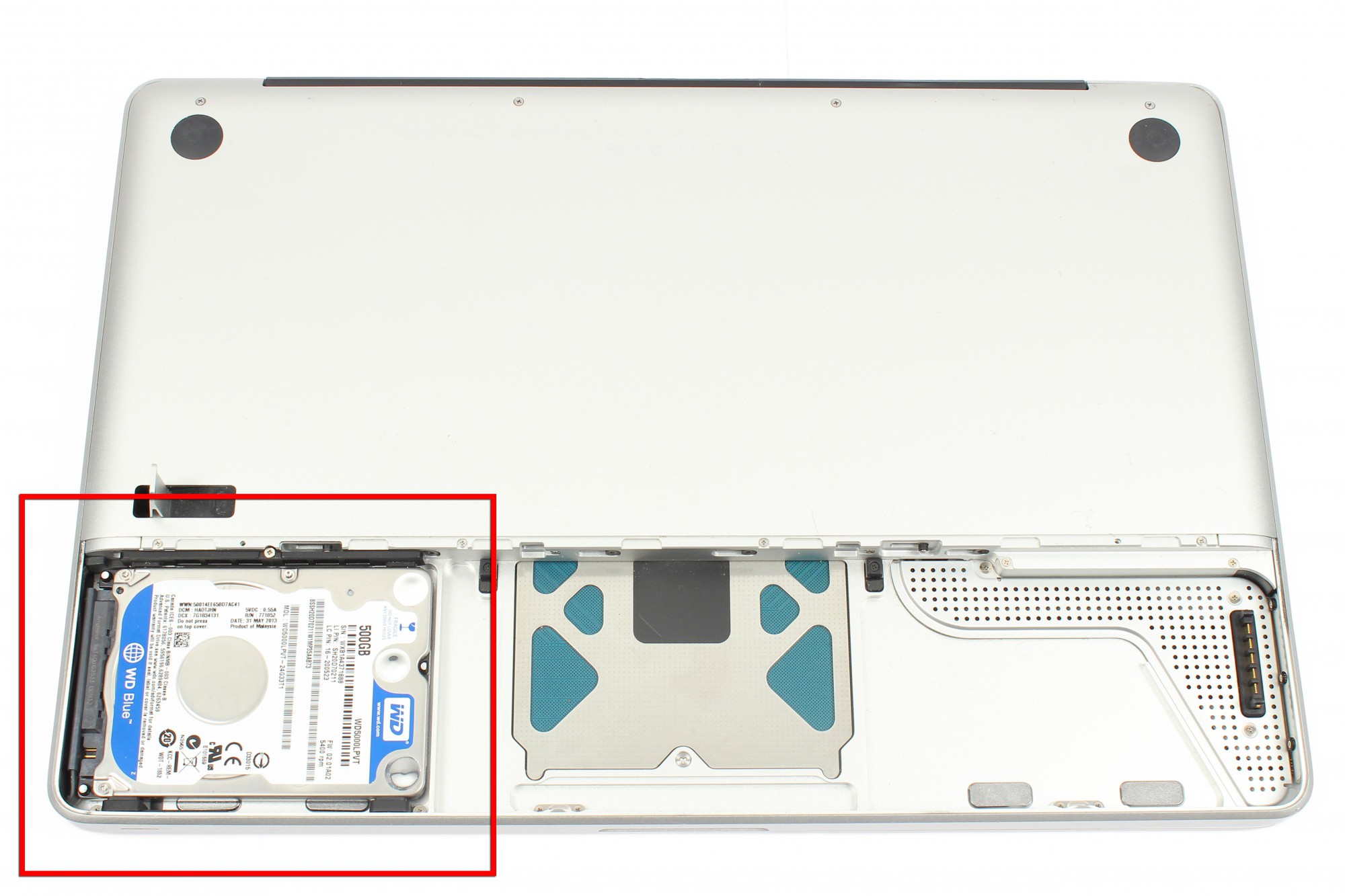 Le disque dur est localisé en bas à gauche (encadré en rouge sur la photo).