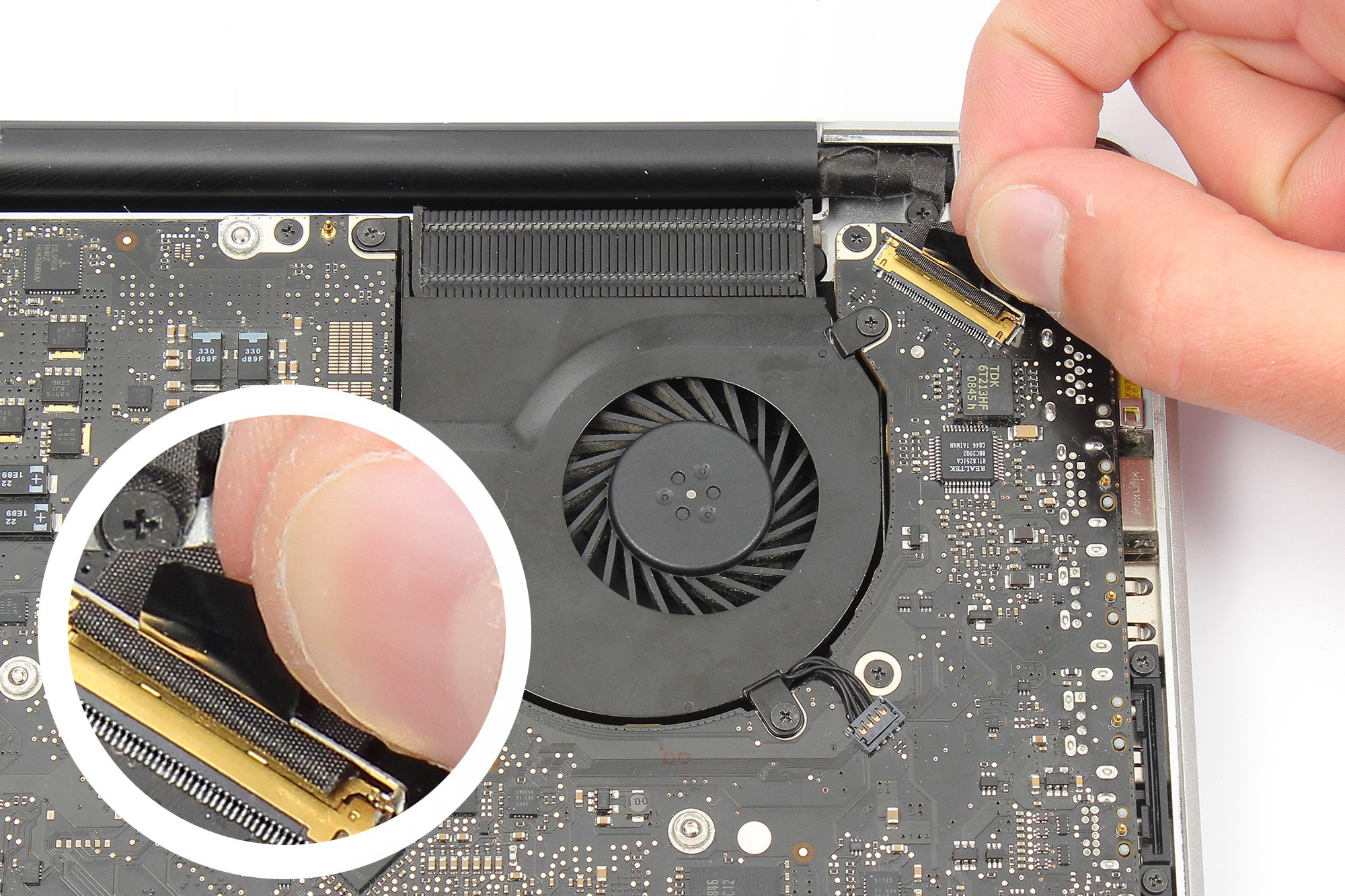 Tirez ensuite légèrement sur la nappe de l'écran LCD (Nappe LVDS) afin de la retirer du connecteur.