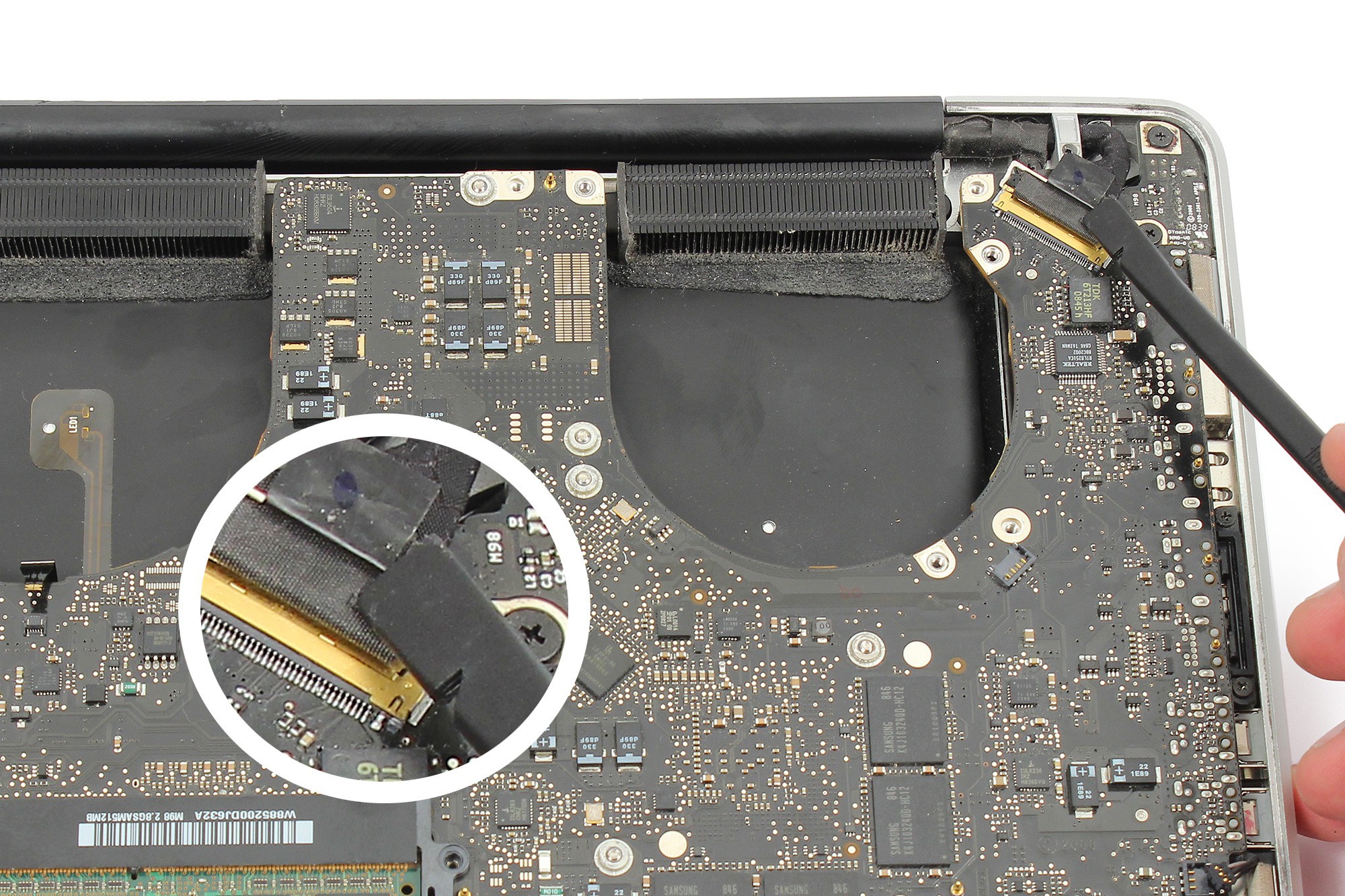 Toujours avec la pointe de la spatule en nylon, soulevez le taquet métallique de verrouillage du connecteur de la nappe principale de l’écran LCD.