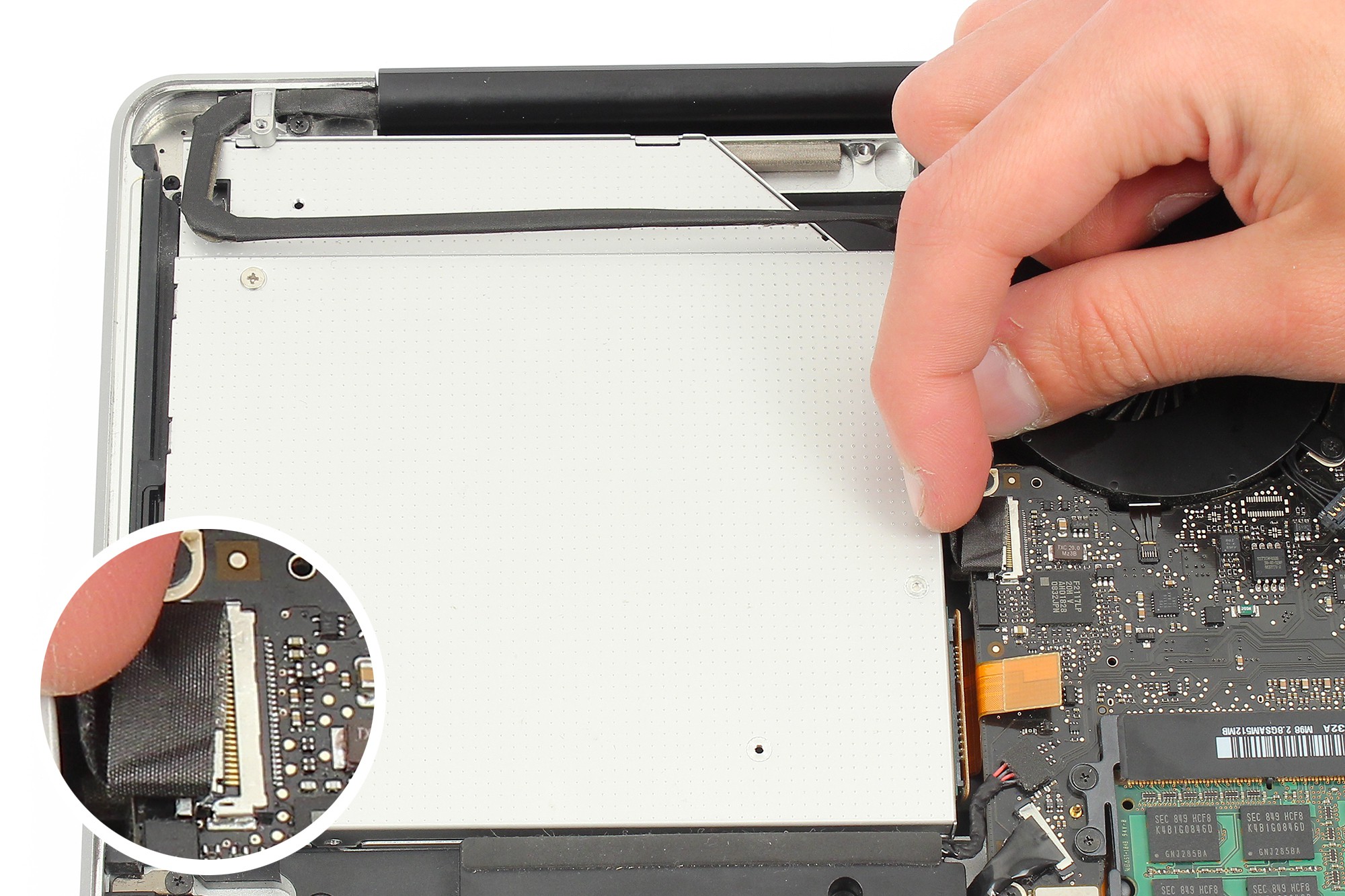 Débranchez la nappe de liaison du lecteur SuperDrive (lecteur optique) en vous servant de la spatule en nylon.