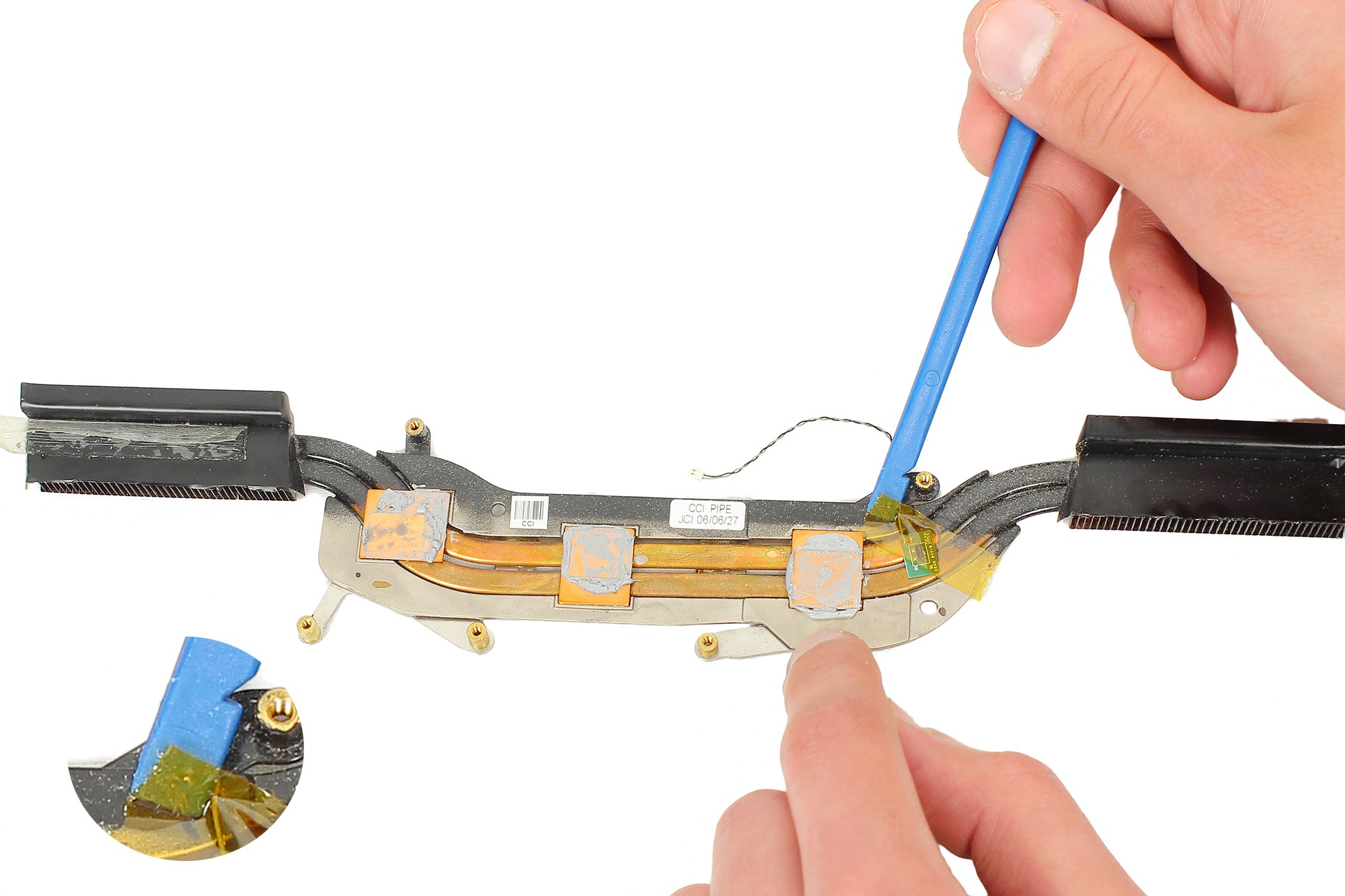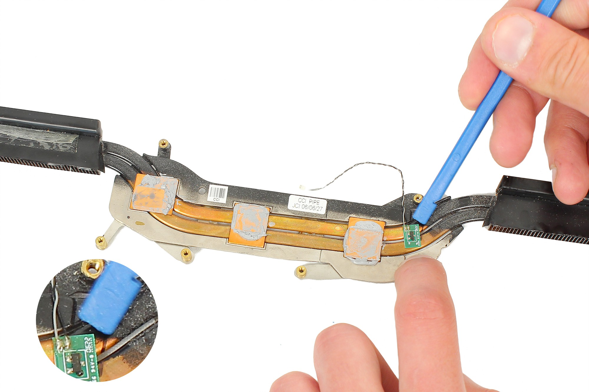 Décollez l'adhésif de maintien du capteur de température du radiateur principal en vous aidant de la spatule en nylon.