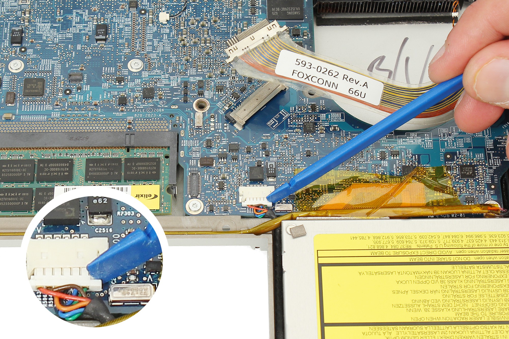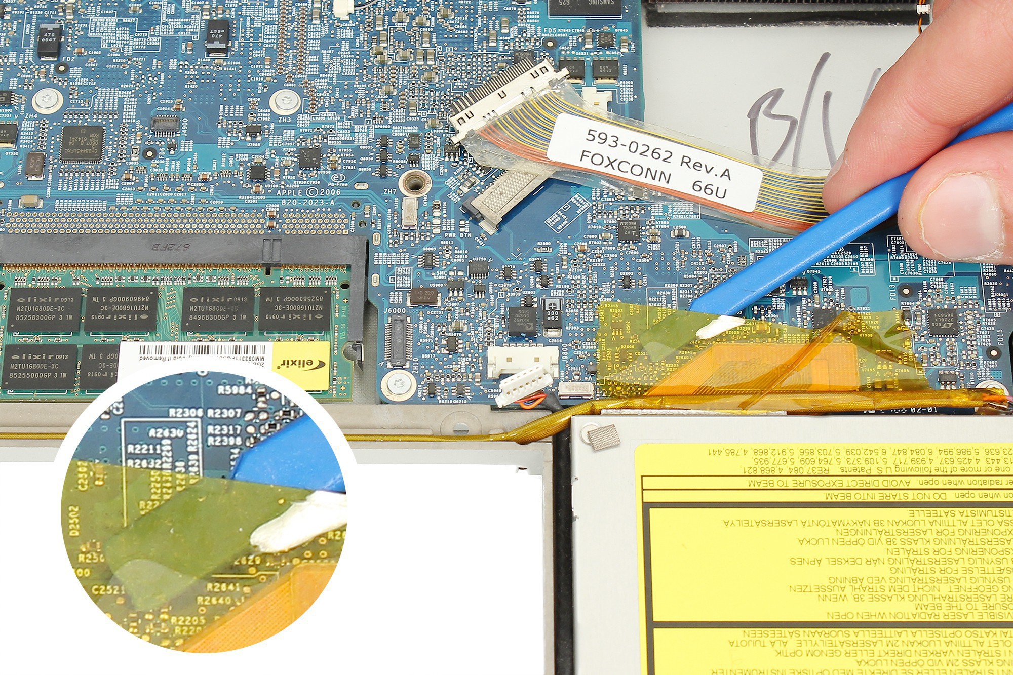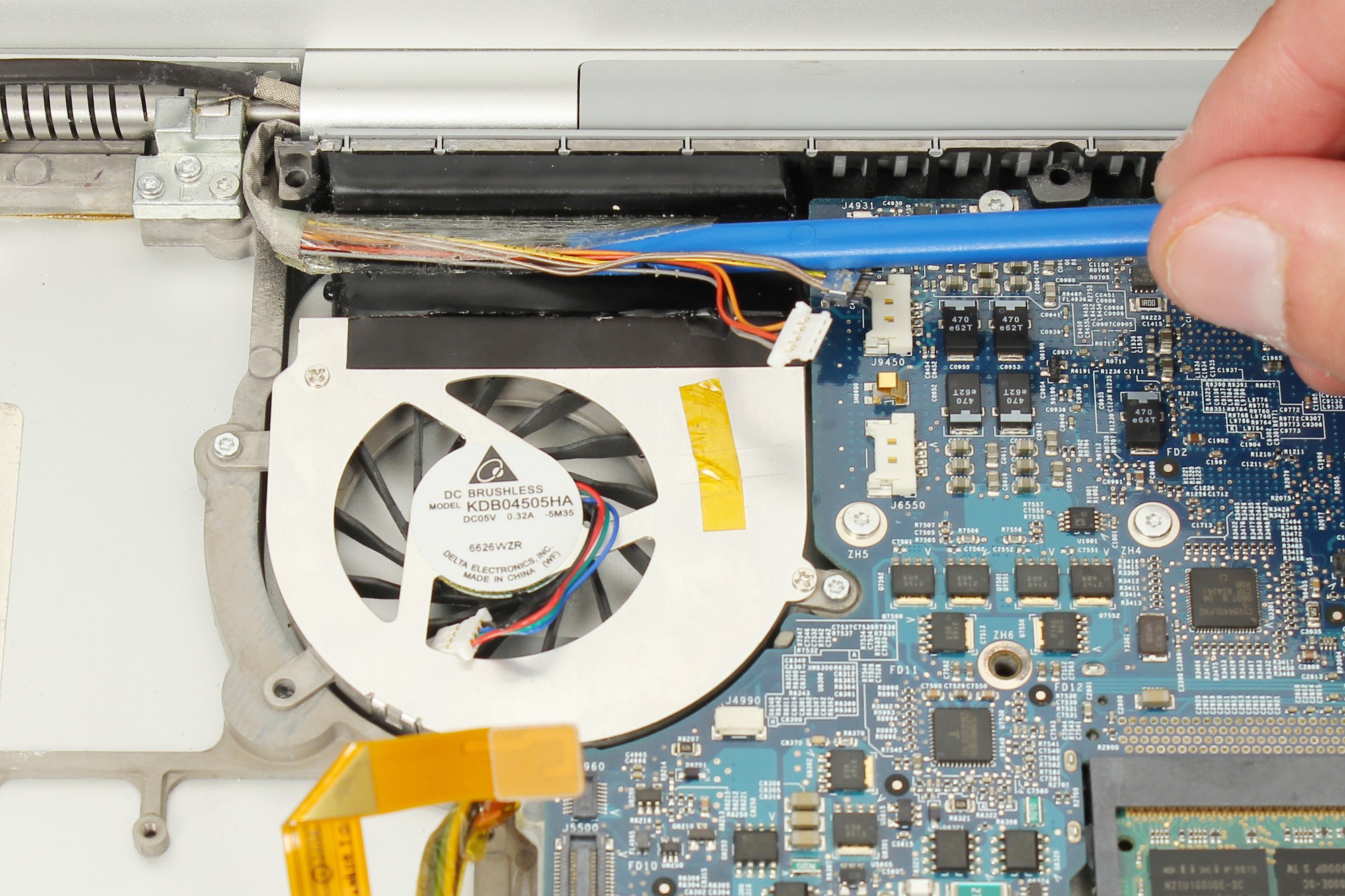 Reprenez la spatule en nylon pour décoller l'adhésif jaune servant à maintenir les nappes disque dur et carte connectique en place.