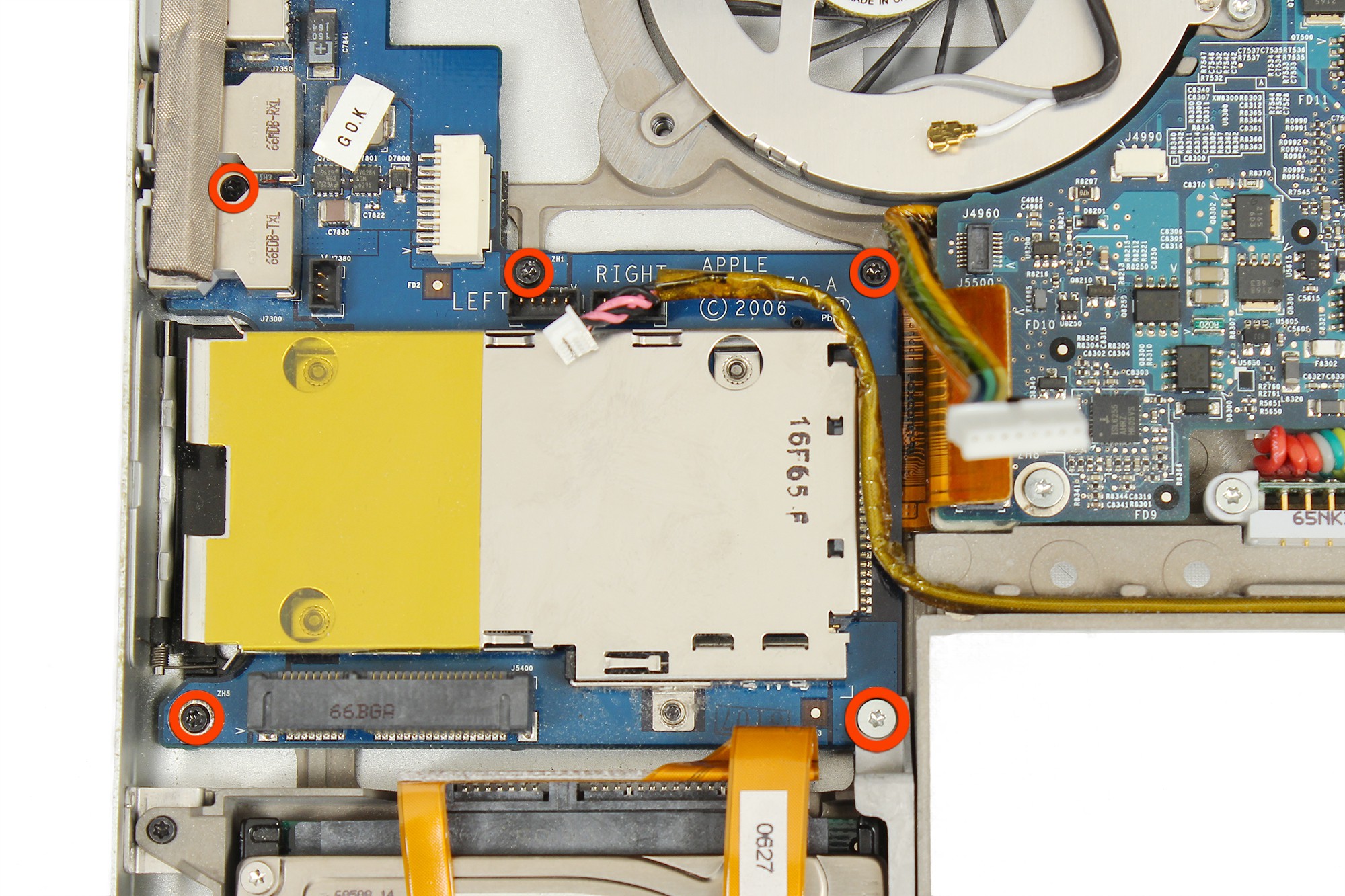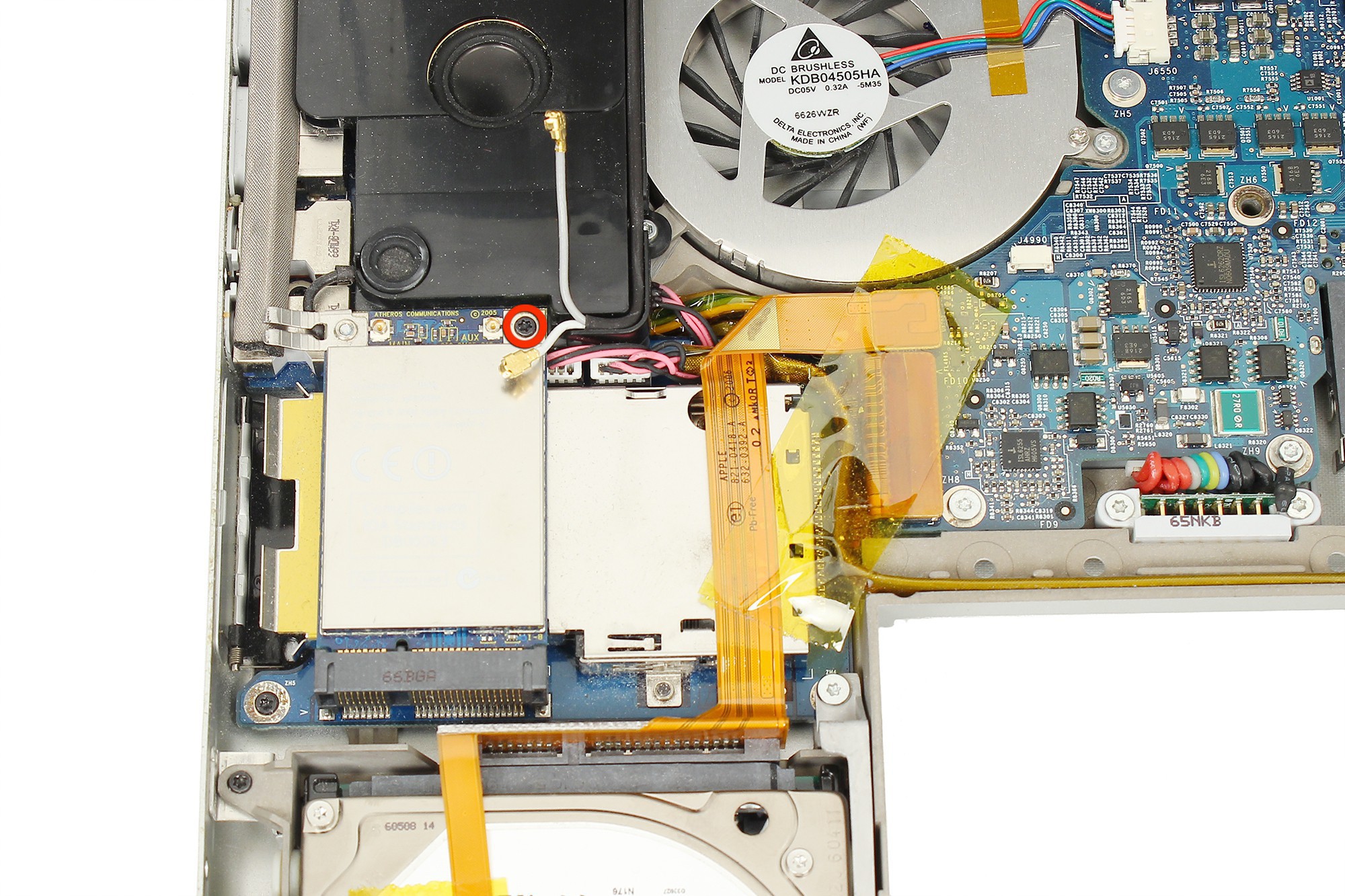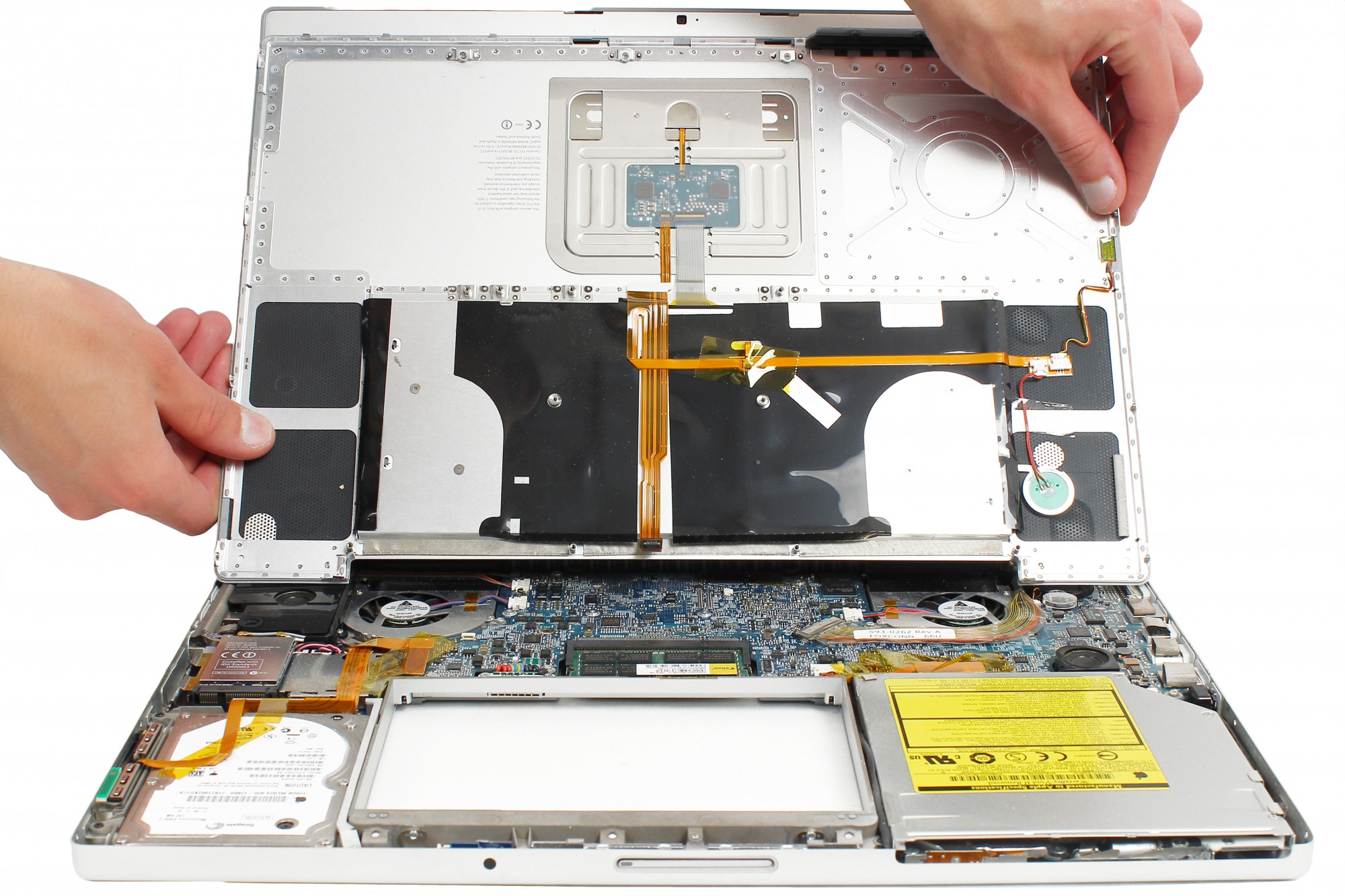 Reprenez la spatule en nylon pour décoller l'adhésif jaune servant à maintenir les nappes disque dur et carte connectique en place.