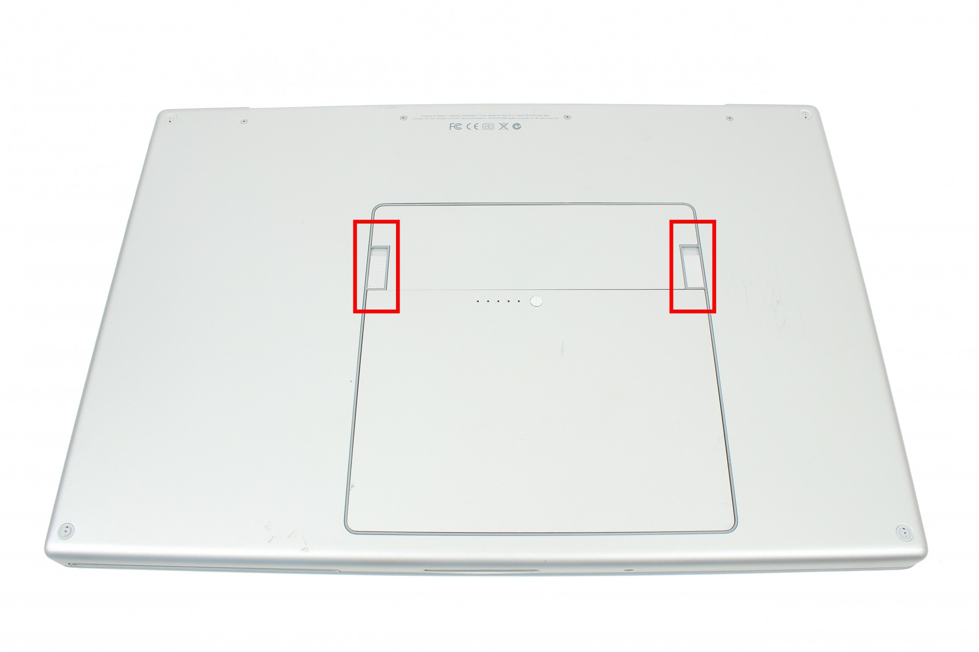 Les clips de verrouillage de la batterie sont localisés par les carrés rouges sur la photo.