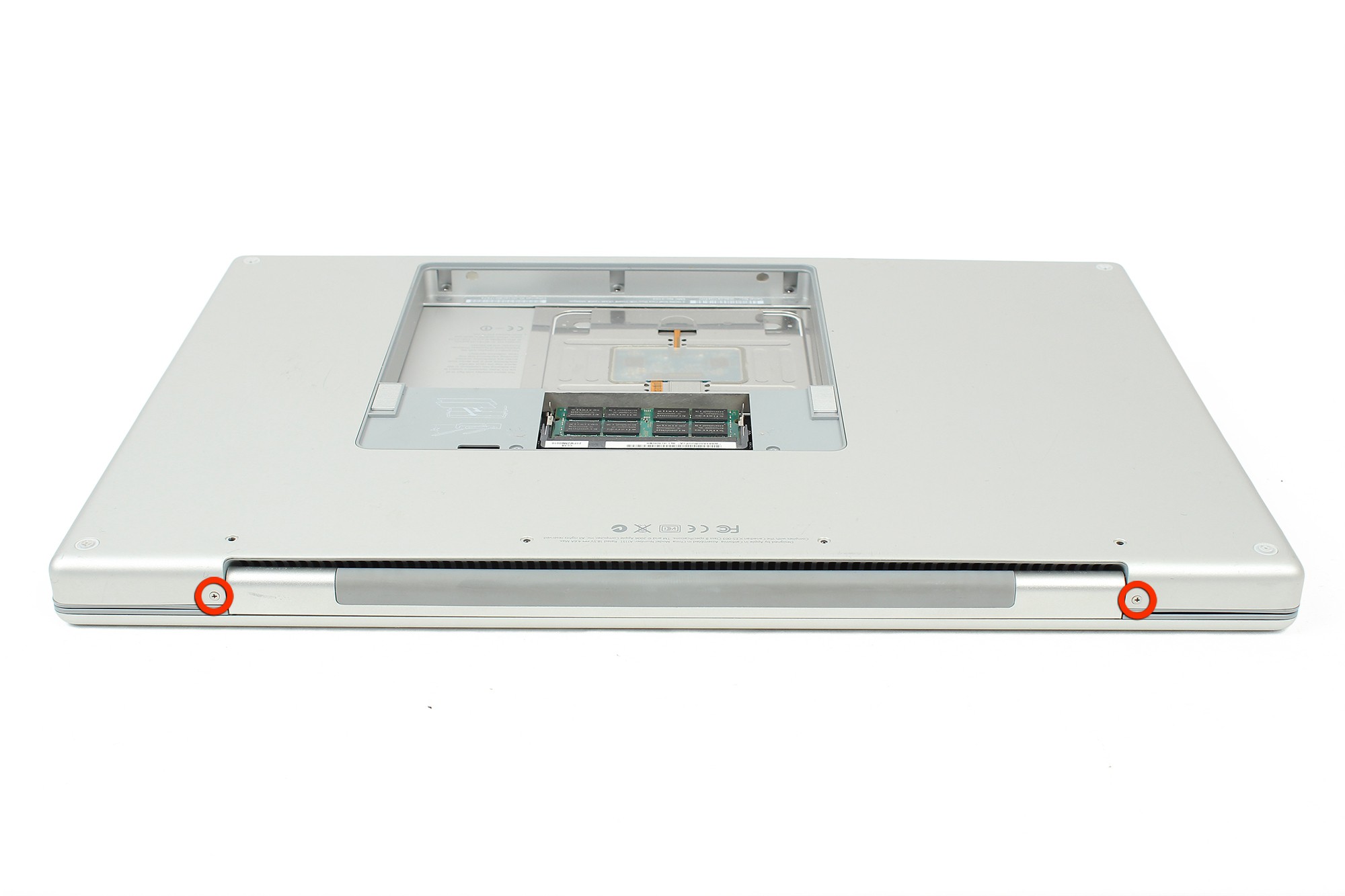 Dévissez ensuite les 2 vis cruciformes localisées sur la tranche arrière du MacBook Pro.