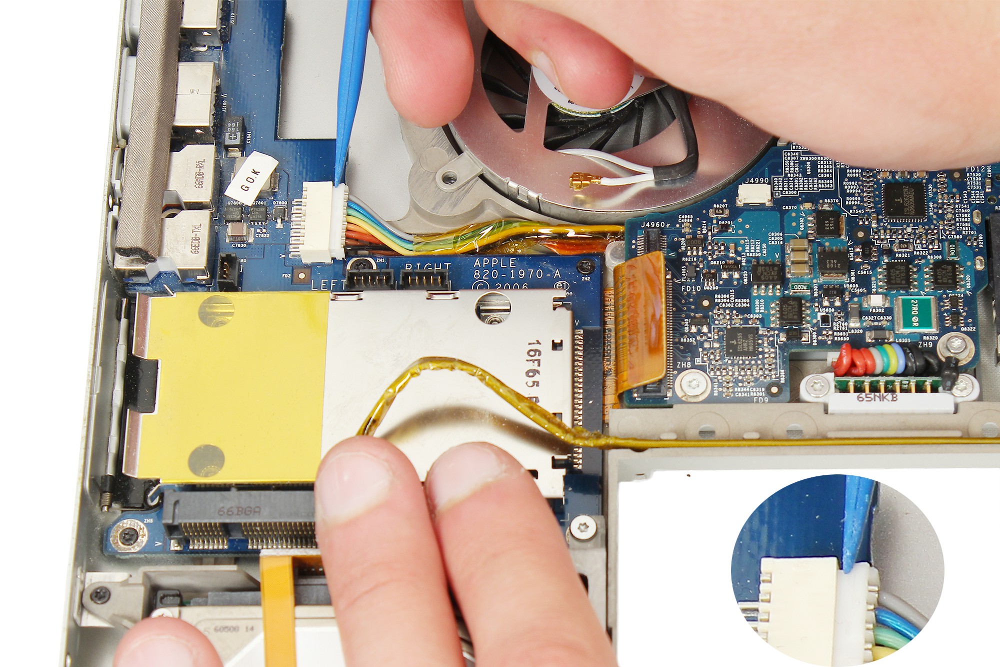 Débranchez ensuite le câble du ventilateur gauche.